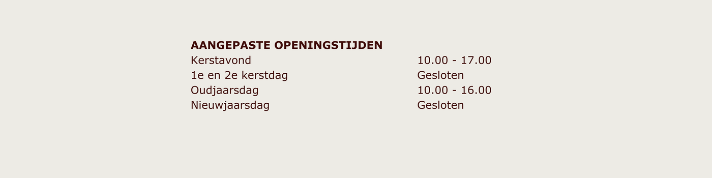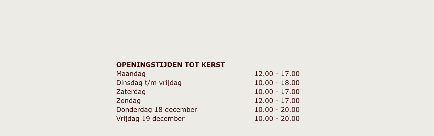 We zijn geopend van dinsdag tot en met vrijdag van 10:00 tot 18:00 uur en op zaterdag van 10:00 tot 17:00 uur.