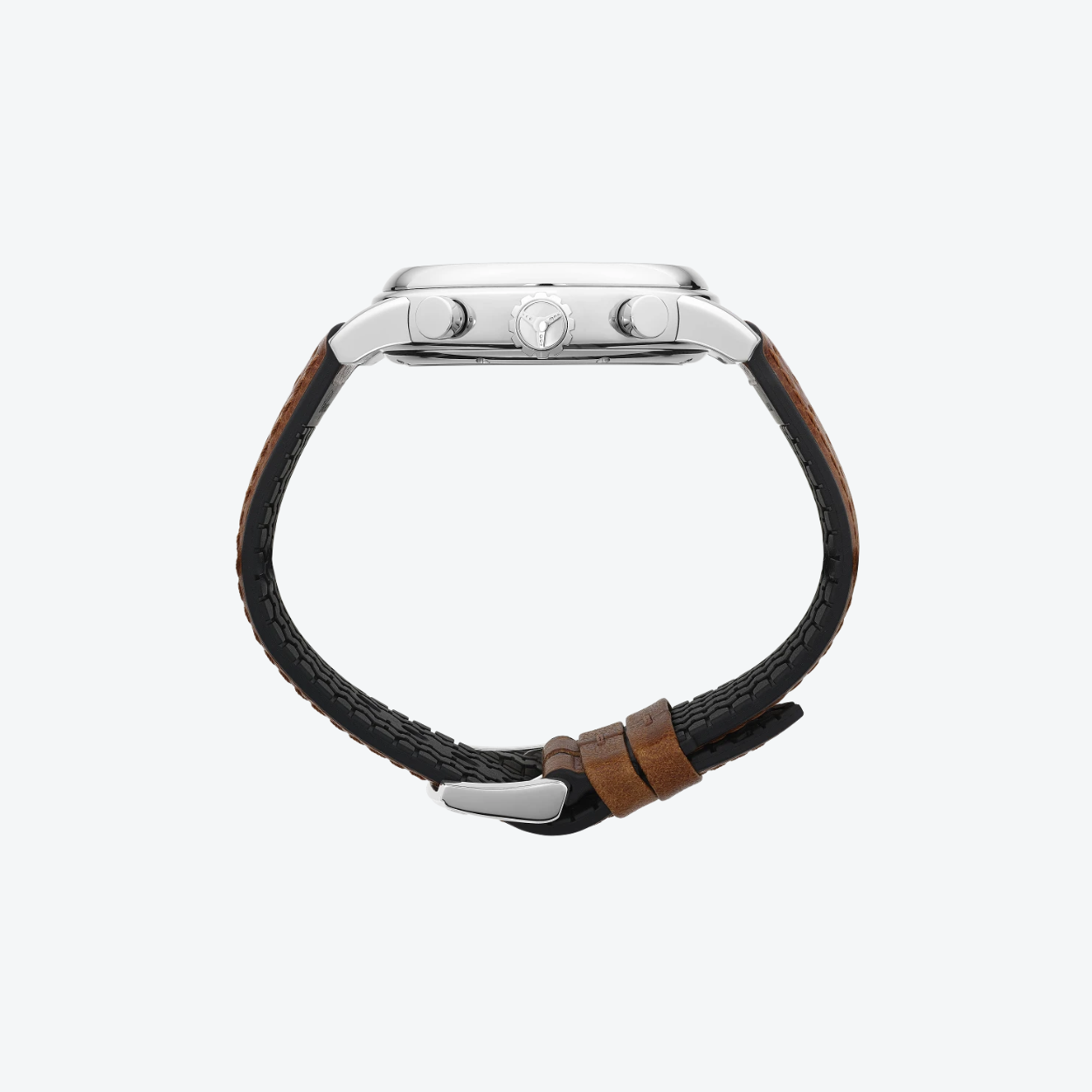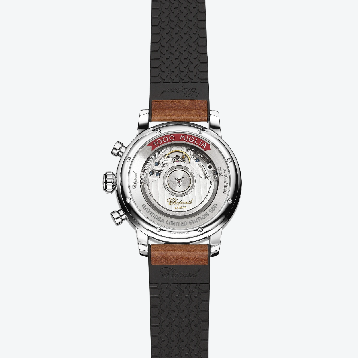 This limited-edition Mille Miglia chronograph—only 500 pieces—pays tribute to the legendary Raticosa Pas, featuring a 42mm polished steel case and a contrasting black dial with luminescent Arabic numerals. Chronograph subdials, a date window at 4 and 5 o'clock, and a tachymeter scale combine functionality with a vintage racing aesthetic. The COSC-certified automatic movement delivers approximately 42 hours of power reserve and is visible through a sapphire crystal caseback inscribed with "1000 Miglia" in red. Perforations in the brown calfskin strap enhance the sporty look, while 50m water resistance offers everyday comfort in refined technical style.