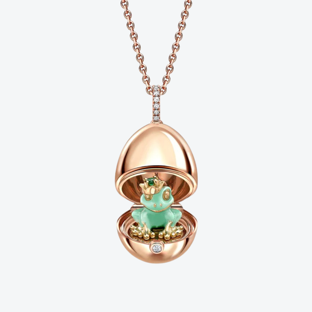 The Fabergé Essence Frog Surprise Locket (reference number 1258FP2370) is a delicate necklace crafted from 18-karat rose gold. The pendant opens like a locket, revealing a green enameled frog with a Zambian emerald in its crown. The exterior is adorned with 14 brilliant-cut diamonds (totaling 0.07 ct). A contemporary interpretation of the classic Fabergé egg, elegant and surprising.
