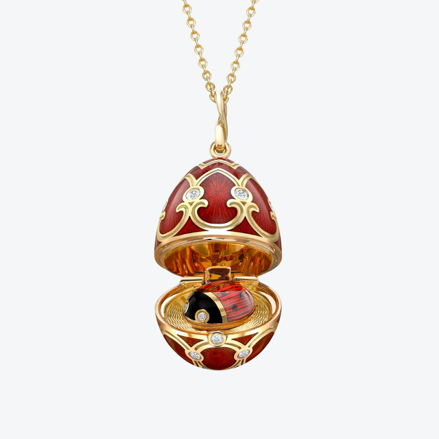 The Fabergé Guilloché Enamel Ladybird Surprise Locket necklace is an ode to happiness and refinement. Crafted from 18-karat rose gold and hand-finished with red guilloché enamel, the pendant opens to reveal a lovingly crafted miniature ladybird, a subtle symbol of prosperity. Part of Fabergé's iconic Heritage collection, this necklace combines graceful forms, surprising details, and traditional craftsmanship in a timeless design that fuses emotion and elegance.