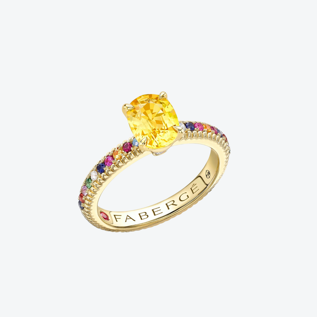 The Fabergé Sapphire Fluted ring is an expressive and elegant creation featuring a bright yellow sapphire. This 18-karat yellow gold ring features a distinctive fluted profile and is set with an oval-cut yellow sapphire, framed by a pavé setting of colorful gemstones in pink, orange, purple, blue, and green. Part of Fabergé's Colors of Love collection, the design symbolizes optimism, connection, and style. A colorful statement piece that exudes craftsmanship in every detail.