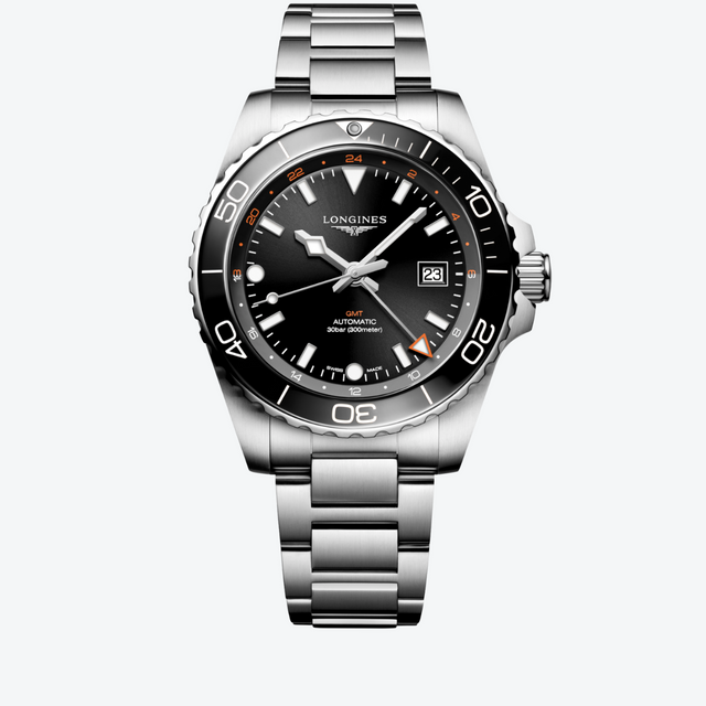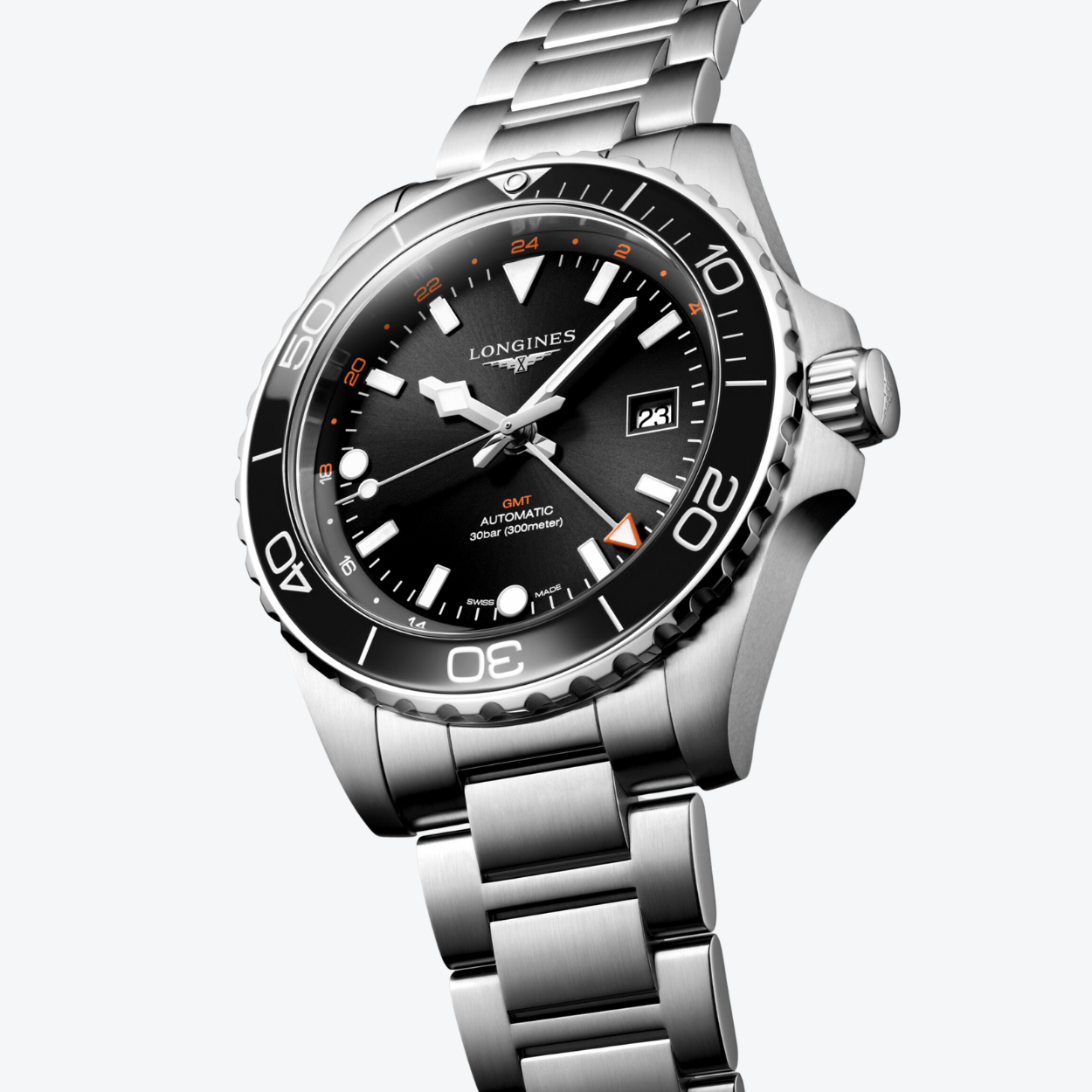 A functional fusion of world clock and diving instrument: this GMT version of the HydroConquest presents itself in a robust 43mm round stainless steel case with a black ceramic unidirectional bezel and a double AR-coated sapphire crystal. The black sunray dial features gold-plated indices and hands with Super-LumiNova®, including a date at 3 o'clock and a contrasting GMT hand for a second time zone. Inside, ticks the automatic GMT caliber L844.5 with a silicon balance spring and approximately 72 hours of power reserve, plus exceptional magnetic resistance. Finished with a steel bracelet with a double safety folding clasp and micro-adjustment, this timepiece offers both innovative technology and water resistance to 30 bar (300 m)—a stylish sports instrument with a five-year international warranty.