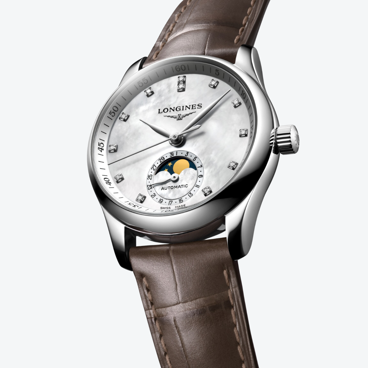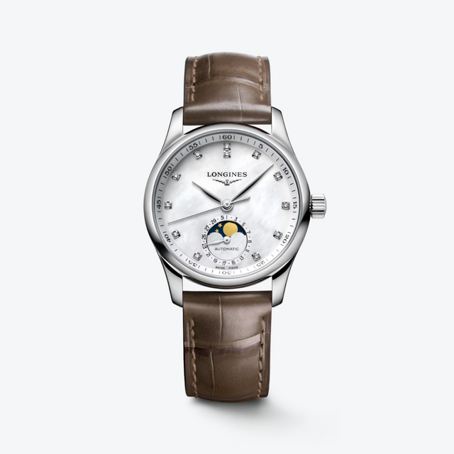 A refined silky touch of feminine elegance from the Master Collection. This automatic model in a 34 mm round size features a momo pearl dial with diamond indexes (0.055 ct) and finely polished hands that harmonize with the stainless steel case and fixed bezel. The sapphire crystal case offers an anti-reflective coating and a visible caseback for the automatic L899 caliber, which powers the hours, minutes, small seconds, date via a subdial at 6 o'clock, and a moon phase movement, with approximately 72 hours of power reserve. The watch is secured on the wrist by an alligator leather strap with a triple safety folding clasp. Water-resistant to 3 bar (30 m) and covered by a five-year international warranty, it is a timeless piece of fine craftsmanship.