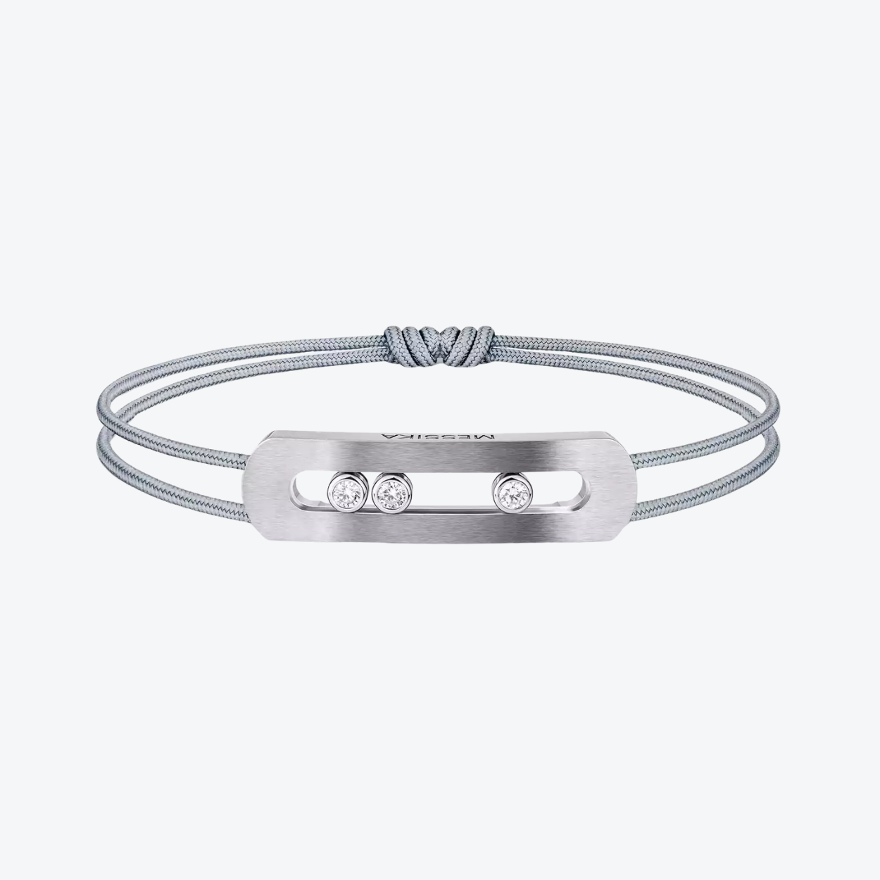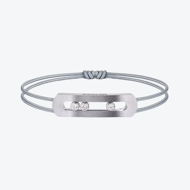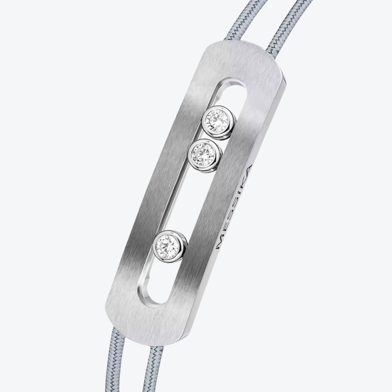 The Messika Move Titanium bracelet in natural titanium is a refined blend of robust minimalism and effortlessly luxurious elegance. The narrow titanium motif, 35 mm long and 10 mm wide, subtly embraces the core of the Move collection: three free-flowing diamonds (0.24 ct G/VS) dancing within a graphic frame. The adjustable strap is equipped with a sliding mechanism, combining comfort and wearability. This bracelet is a refined twist on statement design—bold, subtle, and modern.