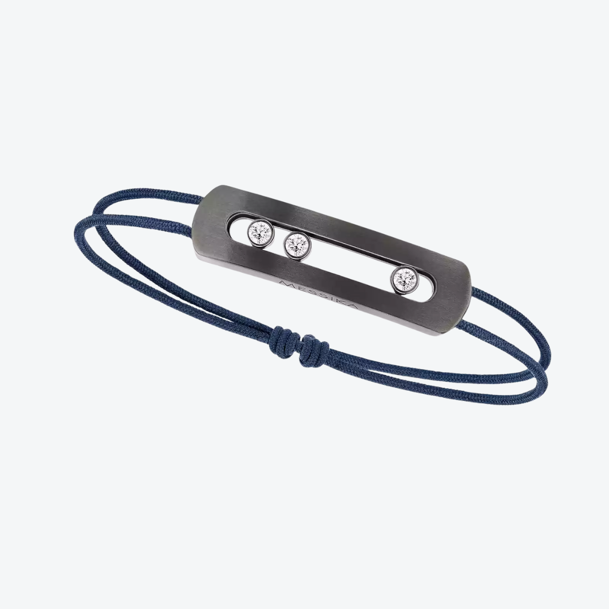 The Messika Move Titanium Graphite bracelet combines bold minimalism with dynamic finesse: a 35mm graphite-colored titanium motif, framed by three free-flowing brilliant-cut diamonds, captures light in subtle flashes. The dark gray metal contrasts beautifully with the sparkle of G/VS diamonds, while the cord with a sliding clasp offers comfort and flexibility. Modern, uncomplicated luxury – perfect for everyday character and elegance.