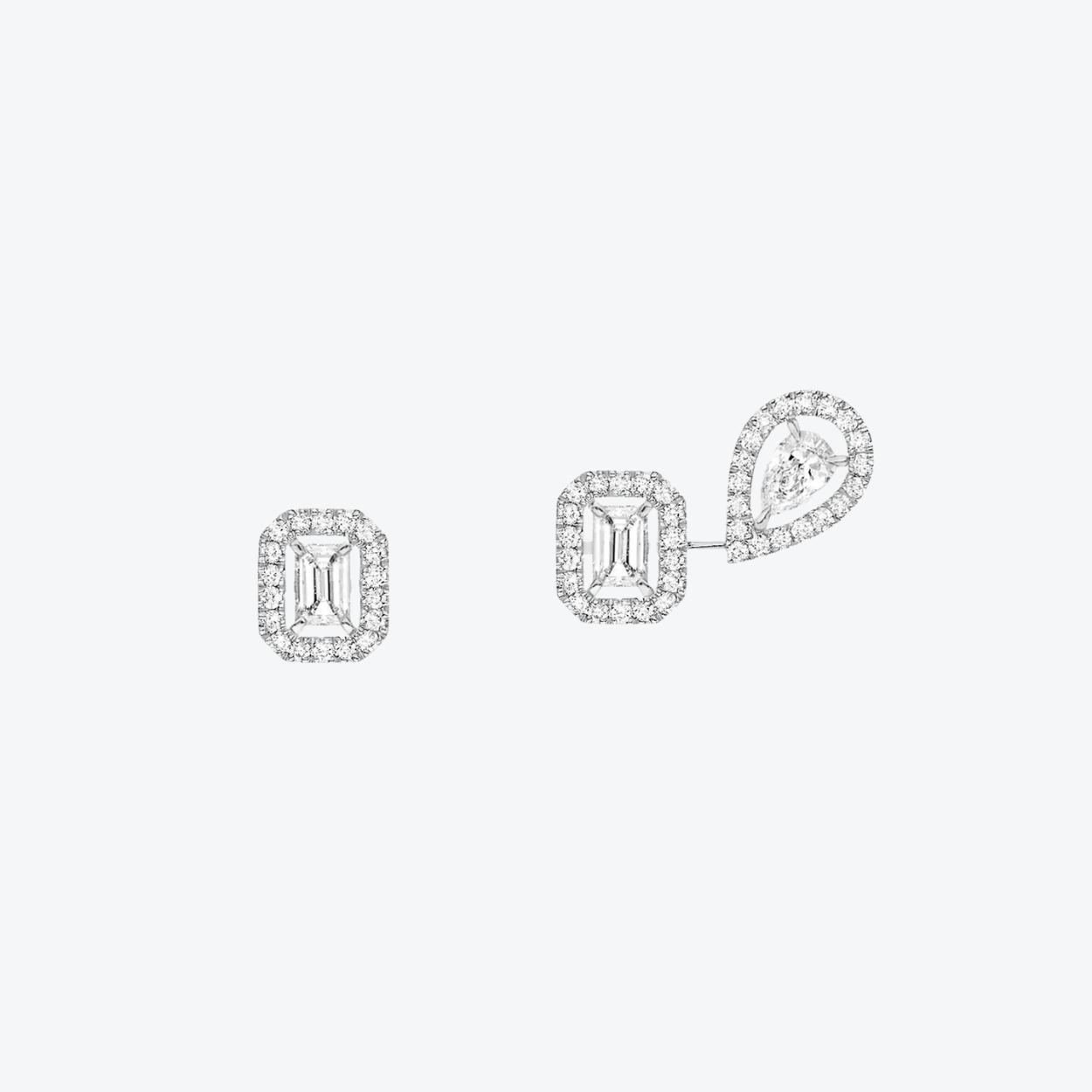 The Messika My Twin 1+2 stud earrings in 18-karat white gold celebrate modern finesse with asymmetric allure: on one side, a solitaire emerald-cut diamond of 0.10 ct sparkles, while on the other, a 0.10 ct emerald and pear-cut diamond each subtly swing with elegant freedom. The illusion of two piercings creates a contemporary twist, perfect for both sleek power looks and sophisticated evenings. An understated statement full of character and playfulness.