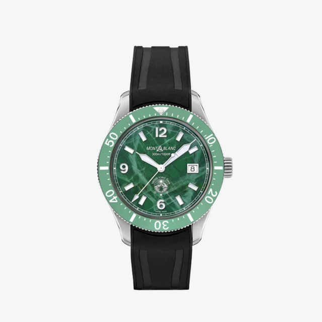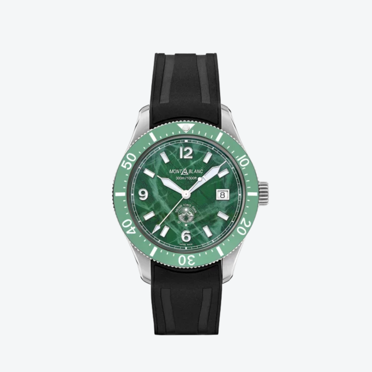 The Montblanc 1858 Iced Sea Automatic Date, reference number MB129765, is a Montblanc diver's watch with a green glacier-patterned dial inspired by the Mer de Glace. Its 41 mm stainless steel case, unidirectional bicolor ceramic bezel, and water resistance to 300 meters (ISO 6425) make this a reliable tool watch. It comes with an interchangeable black rubber strap with a fine adjustment system for a perfect fit.