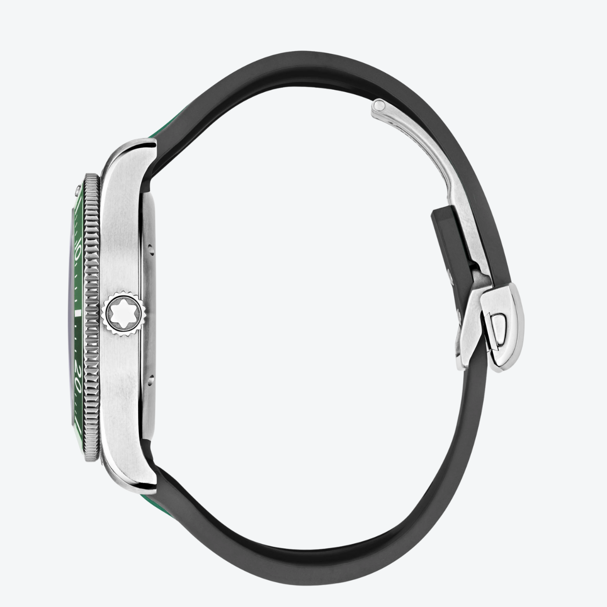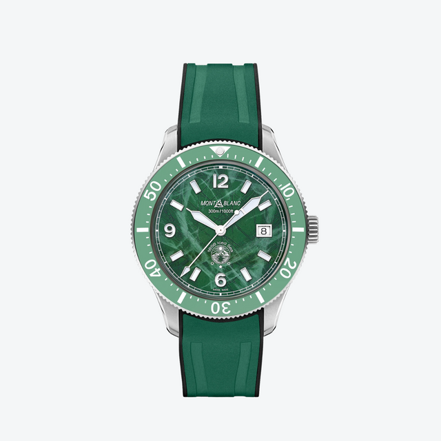 The Montblanc Iced Sea Automatic Date 41 mm, MB131450, Montblanc's first professional diving watch, combines technical performance with refined finishing. The green glacier dial, inspired by the Mer de Glace of the Mont Blanc massif, is crafted using the rare gratté-boisé technique, giving the impression of peering deep into a glacier. The 41 mm stainless steel case features a two-tone unidirectional ceramic bezel and a screw-down crown. The titanium caseback is embossed. The watch meets the ISO 6425 diving standard, is water-resistant to 300 meters, and has a tapered, interchangeable steel bracelet with fine adjustment.