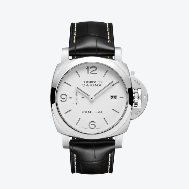The Panerai Luminor Marina Quaranta 40 mm – PAM01372 combines iconic Luminor design in a compact package. The 40 mm case in brushed AISI 316L steel features the signature crown and a polished bezel. The black sun-brushed dial with luminous Arabic numerals offers optimal readability thanks to the small seconds at 9 o'clock and the date window at 3 o'clock. Under the sapphire crystal, the automatic P.900 caliber with Incabloc® anti-shock movement, 23 jewels, and a three-day power reserve works. The black alligator leather strap with a Click Release system and trapezoid buckle offers comfort and elegance. With a water resistance of up to 10 bar (100 m), this Quaranta is a perfect companion for everyday wear.
