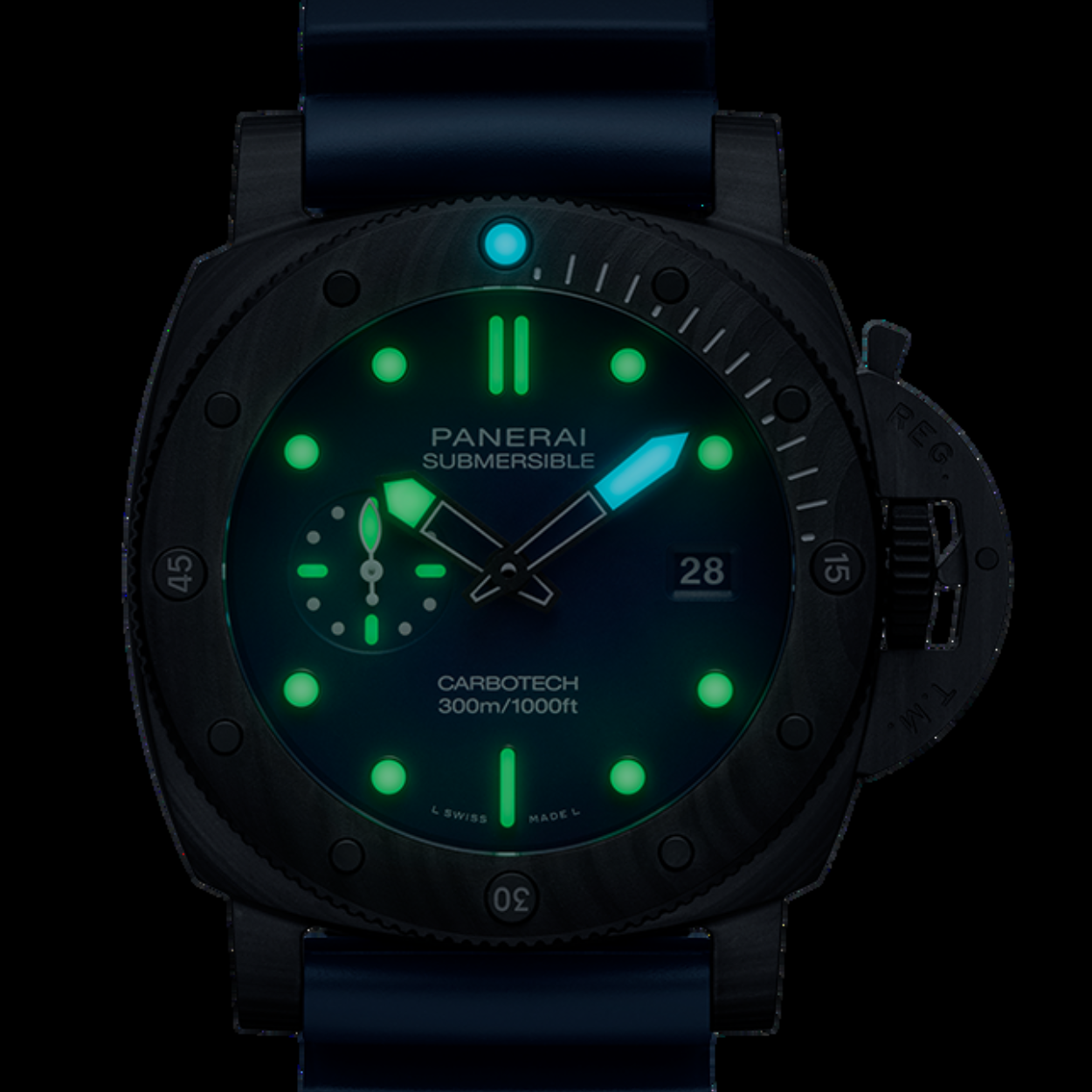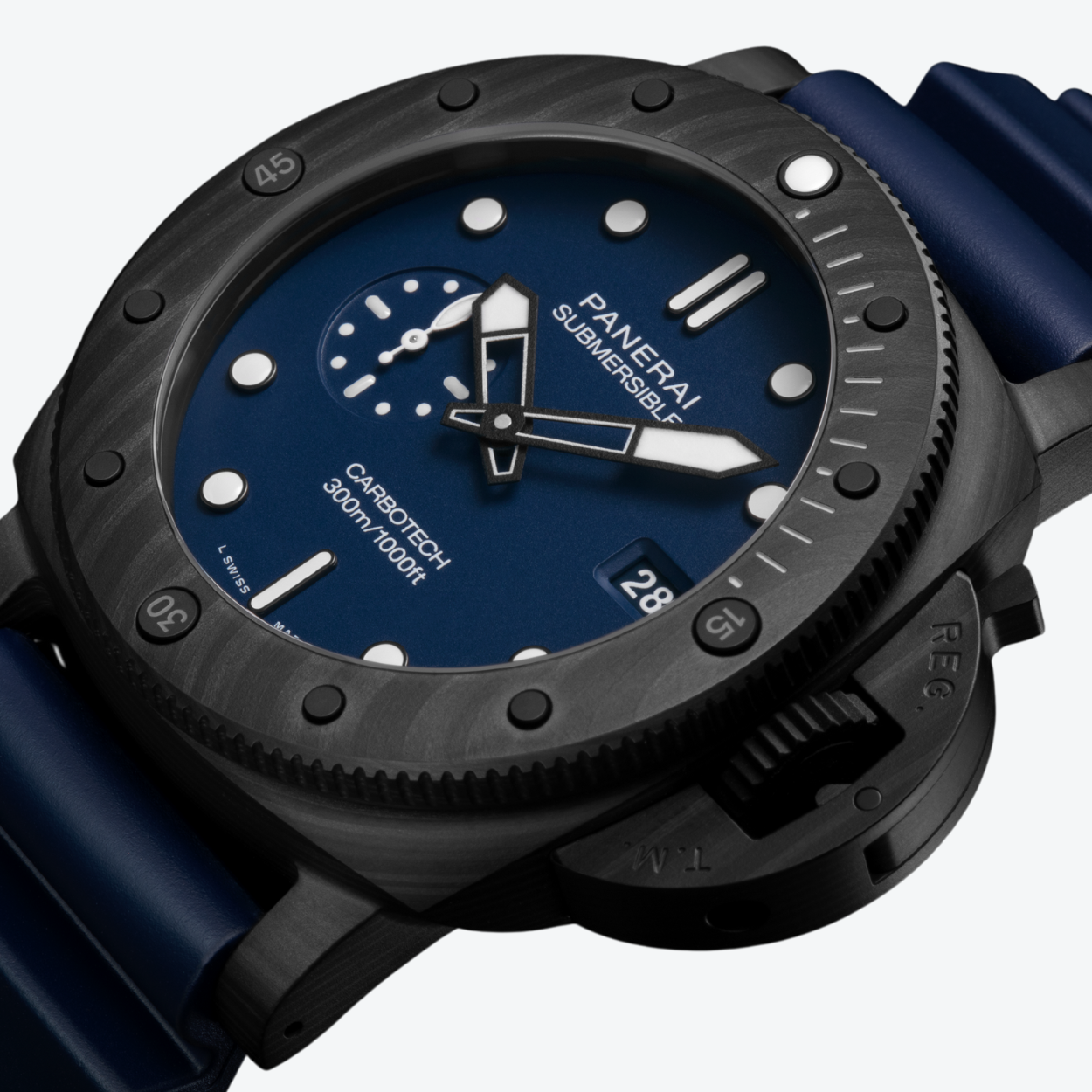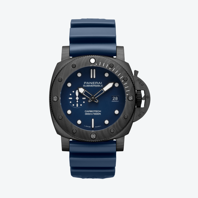 The Panerai Submersible QuarantaQuattro Carbotech™ 44 mm – PAM01232 is a rugged and lightweight diving watch that combines strength and finesse in a single design. The case and bezel are crafted from Carbotech™, an innovative carbon fiber composite that is exceptionally strong and corrosion-resistant. The deep blue “Blu Abisso” dial features luminous indices, a small seconds at 9 o’clock, and a date display at 3 o’clock, ensuring excellent readability under all conditions. Powered by the automatic P.900 caliber with 23 jewels, 28,800 A/h, Incabloc® shock protection, and a 72-hour power reserve, this model guarantees durability and precision. With water resistance to 30 bar (300 m), sapphire crystal, and a comfortable blue rubber strap with a titanium DLC mirror clasp, this watch is a reliable and stylish choice for both marine adventures and everyday use.
