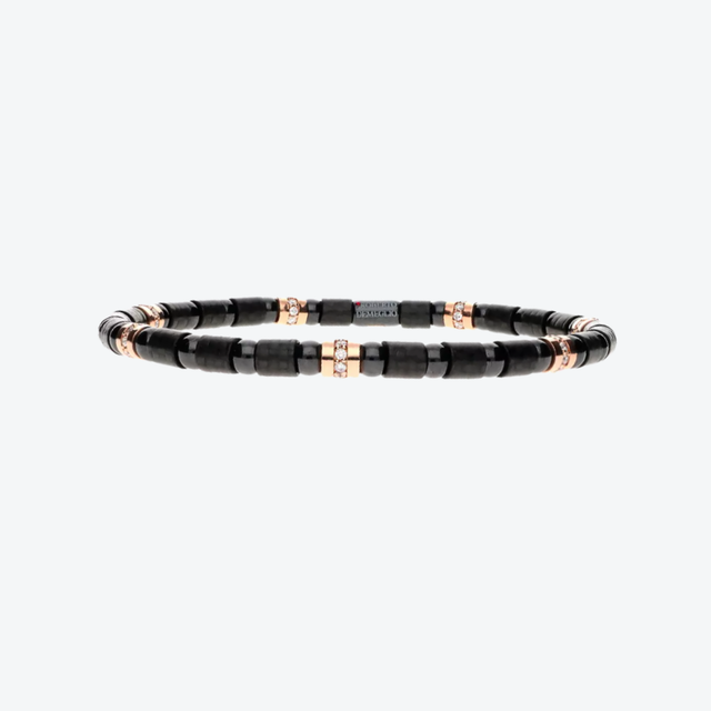 De Roberto Demeglio Carbonio armband keramiek diamant 9C4N7DBOR is een stijlvolle expressie van innovatie en elegantie. Deze verfijnde flexarmband is met de hand vervaardigd uit diepzwart keramiek en verfraaid met accenten van 18 karaat roségoud. De schittering van witte diamanten vormt een prachtig contrast met het donkere oppervlak, wat het sieraad een moderne, luxueuze uitstraling geeft. Dankzij de flexibele constructie sluit de armband soepel om de pols, wat comfort en klasse moeiteloos combineert.