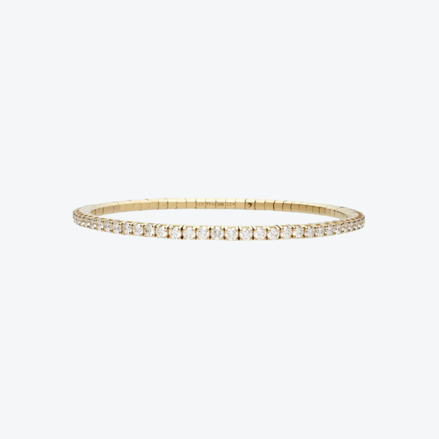 De Roberto Demeglio Extensible Tennis armband geelgoud witte diamant BTE85DBOG straalt pure klasse en tijdloze elegantie uit. Deze luxueuze flexarmband is met de hand vervaardigd uit 18 karaat geelgoud en volledig bezet met briljant geslepen witte diamanten die bij elke beweging schitteren. Dankzij de innovatieve Extensible-technologie is de armband elastisch en sluit hij perfect om de pols, zonder dat een sluiting nodig is. Een verfijnd meesterwerk dat Italiaanse perfectie en draagcomfort tot kunst verheft.