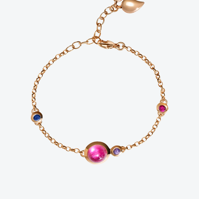 The Tamara Comolli Bouton Mini Chain bracelet 'Wildberry' is a poetic interplay of color and elegance. Crafted from refined 18kt rose gold, it features an 8mm cabochon-cut tourmaline (approx. 2.2 ct), complemented by three dazzling 3mm brilliant-cut pink and blue sapphires, and a violet sapphire (each weighing 0.13 ct). With a total length of 18.5cm and an adjustable length from 14.5cm to 17.5cm, it offers both comfort and versatility for layering, for everyday wear with a playful, colorful twist.