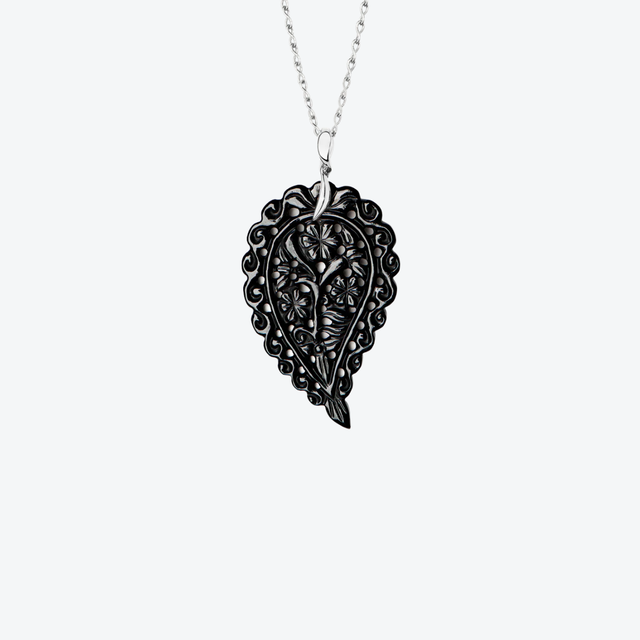 The large India pendant is a subtle statement of artisanal finesse. Crafted in 18k white gold, this pendant houses a hand-cut, 45-carat, leaf-shaped black onyx. The total length of the piece is 65.3 mm, and the leaf itself measures approximately 54.3 mm—worn on a fine leather cord or necklace. A warm, timeless choice that effortlessly combines elegance and personality.