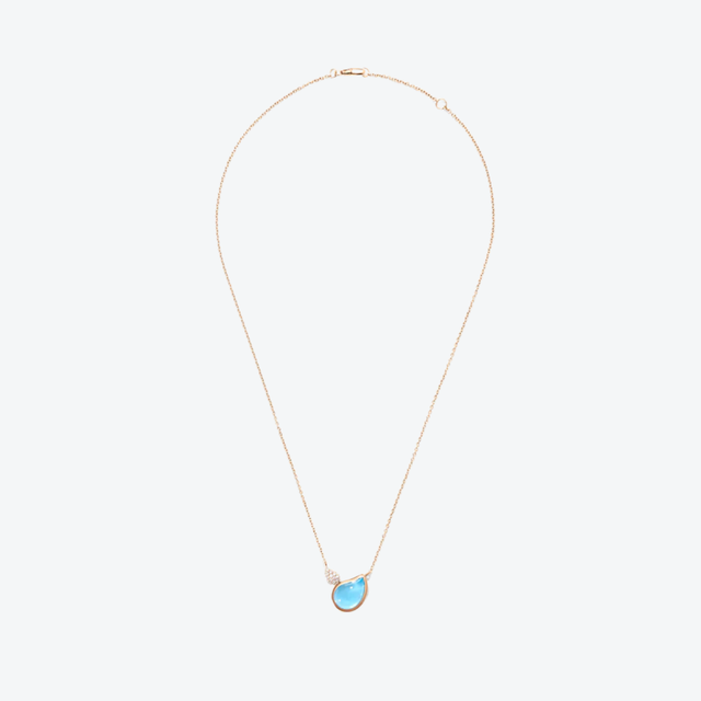 This delicate Signature 2 Drops necklace in polished 18k rose gold is a subtly playful piece. It combines two droplets: one entirely set with diamond pavé (totaling 0.19 ct, G/SI), the other with radiant Swiss Topaz. Both pendants measure 15mm high and 18mm wide, hanging from an adjustable chain—ideal for layering or wearing alone with grace and allure.