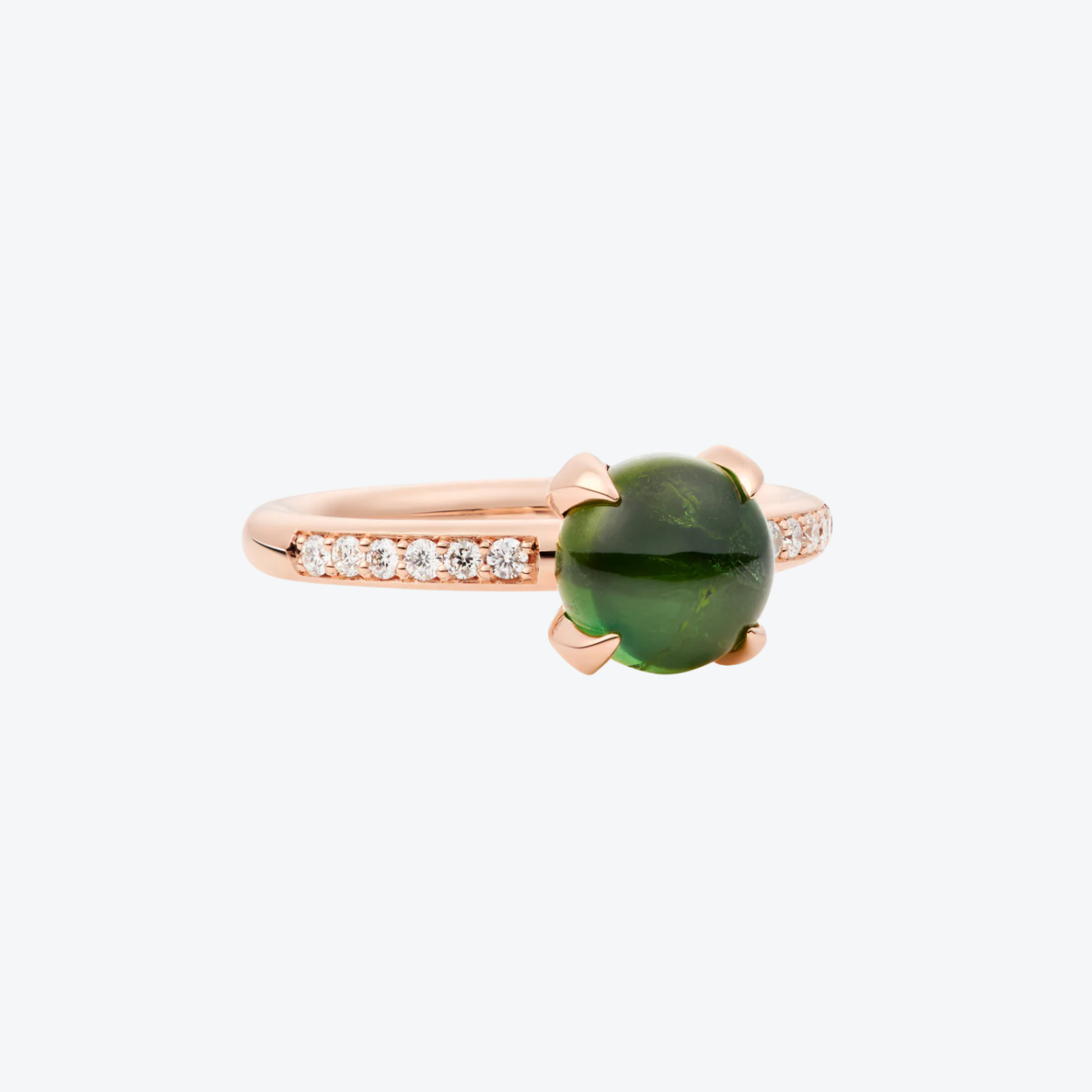 De Bron Catch ring 8RR4811GTCBR is een expressieve creatie uit de speelse Catch-collectie. Deze ring is vervaardigd in 18 karaat roségoud en gezet met een levendige groene toermalijn, omlijst door briljant geslepen diamanten die voor extra schittering zorgen. Het rijke groen van de edelsteen contrasteert prachtig met het warme roségoud, terwijl de diamanten het geheel een luxueuze fonkeling geven. Een karaktervolle ring die elegantie en kleur op unieke wijze samenbrengt.