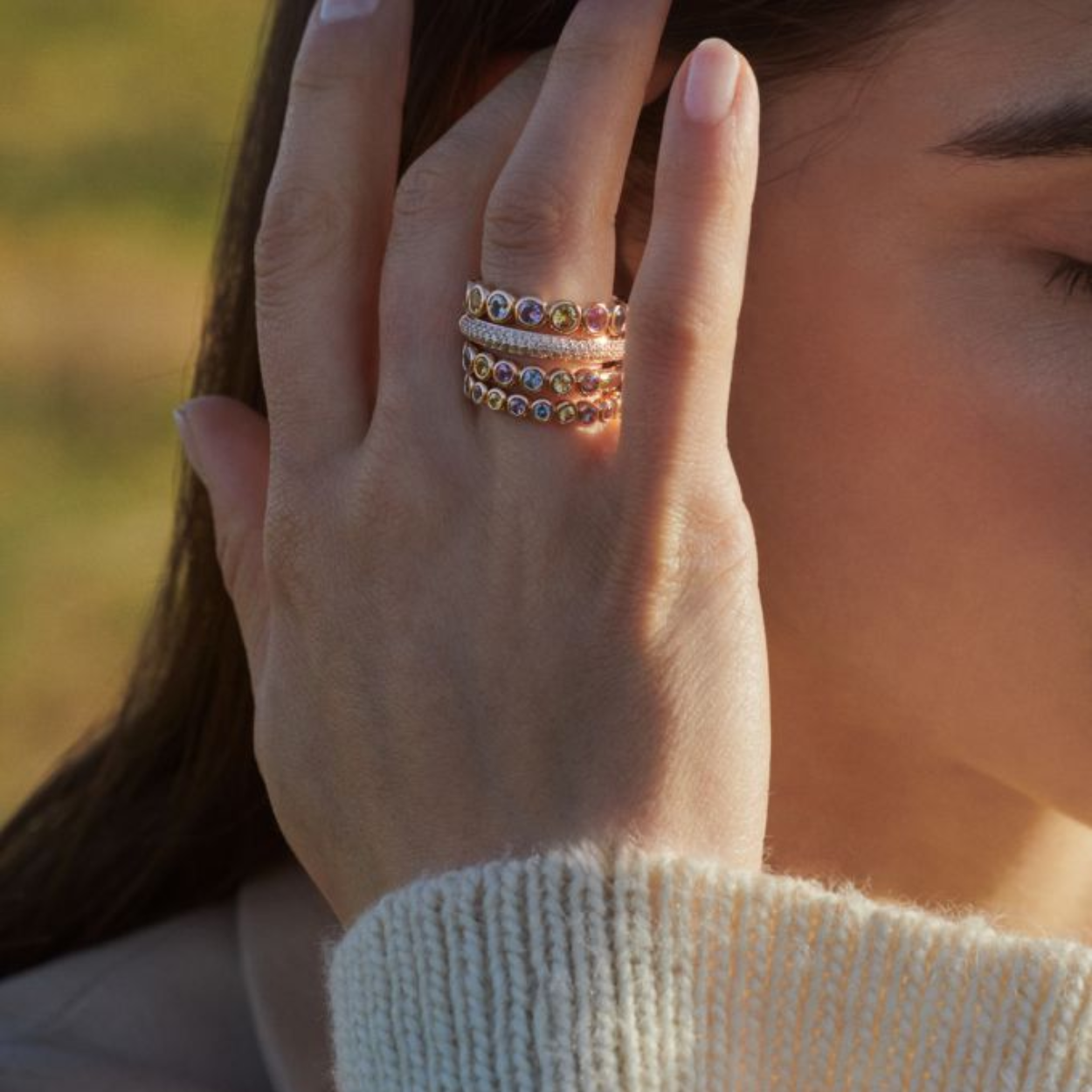 De Bron Confetti ring 8RR4872LIGHT is een sprankelend juweel uit de vrolijke Confetti-collectie. Vervaardigd in 18 karaat roségoud en gezet met een levendige mix van saffieren, laat deze ring een rijk palet aan kleuren schitteren. Het speelse ontwerp benadrukt de unieke combinatie van edelstenen en maakt elk exemplaar bijzonder. Een expressief sieraad dat warmte en levensvreugde uitstraalt.