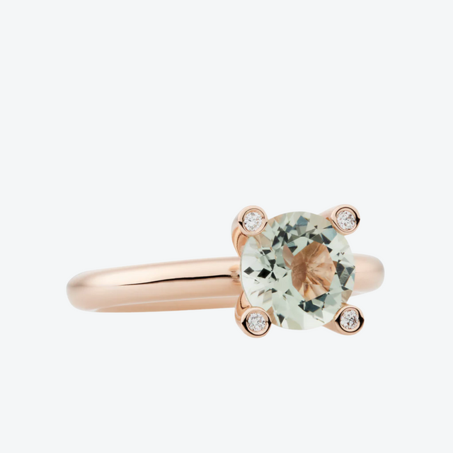 De Bron Phlox ring 8RR4531LQBR is een verfijnde creatie uit de elegante Phlox-collectie. Deze ring is vervaardigd in 18 karaat roségoud en gezet met lemonkwarts, omlijst door briljant geslepen diamanten die voor een subtiele fonkeling zorgen. Het frisse geelgroene karakter van de lemonkwarts vormt een harmonieus contrast met de warme gloed van roségoud en de sprankeling van de diamanten. Een stijlvolle ring die frisheid en luxe op tijdloze wijze verenigt.