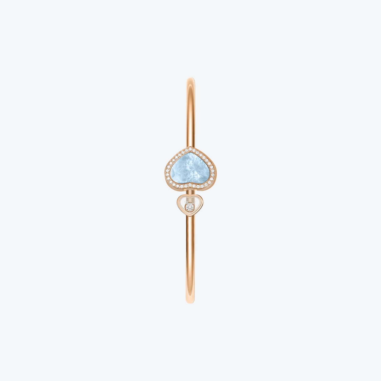 Deze Happy Hearts armband is uitgevoerd in 18 karaat roségoud en combineert twee iconische harten: één met turquoise parelmoer en briljant pavé, en één met een vrij bewegende diamant die licht vangt bij elke polsbeweging. De open, rigide vorm draagt comfortabel en geeft een moderne, vrouwelijke uitstraling, een speels statement met verfijnde luxe.