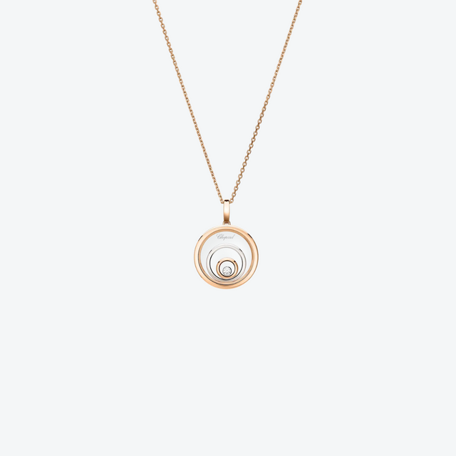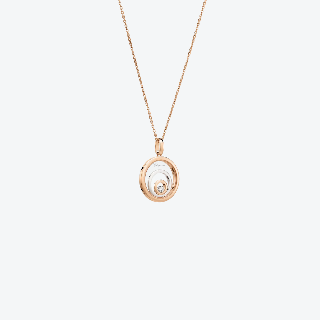 Dit collier uit de Happy Spirit-lijn is een subtiel samenspel van twee goudtonen: roségoud en witgoud. Hij is uitgevoerd in 18 karaat en bevat een vrij bewegende diamant, gevangen in een elegant ontwerp waarin de twee metalen harmonieus samenkomen, een sierlijk symbool van balans en stijl.