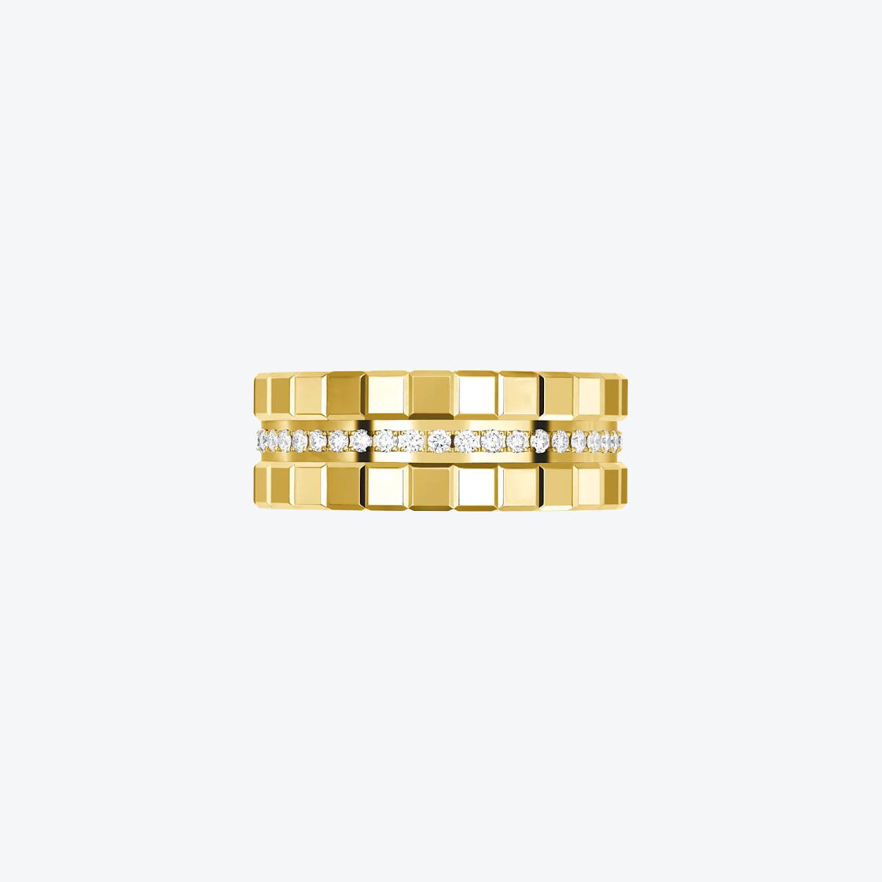 De Ice Cube ring combineert geometrische zuiverheid met sprankelende finesse uitgevoerd in 18 karaat geelgoud en bezet met diamanten (ca. 0,30 ct) langs de contouren van de kubusstructuur. Het strakke ontwerp vangt het licht in elk facet en levert een moderne, ingetogen expressie op.