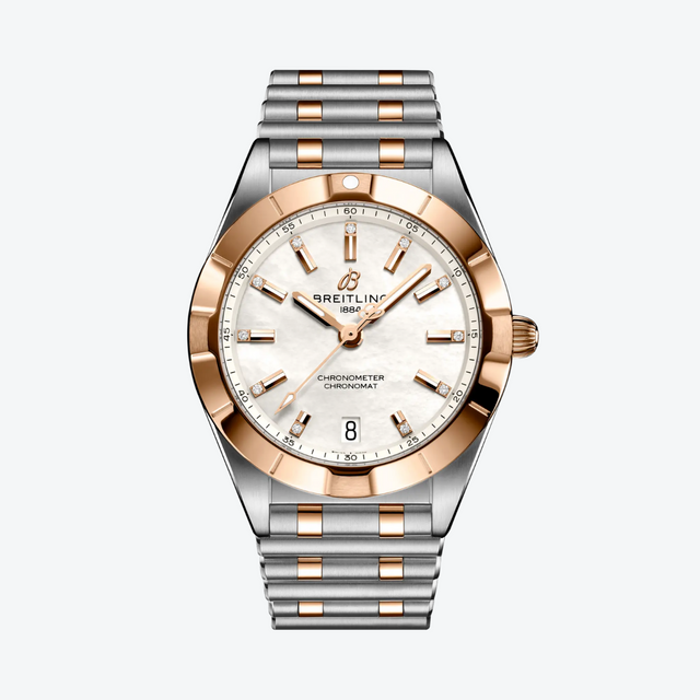De Breitling Chronomat 32 combineert moderne stijl met retro charme, waardoor het de perfecte mix is van sportief en chic voor elke gelegenheid. Verkrijgbaar in verschillende metalen, van roestvrij staal tot luxe 18k roodgoud, met de optie voor een diamanten bezel en kleurrijke wijzerplaten voor extra glamour. Het horloge is uitgerust met Breitling's iconische "Rouleaux" armband en wordt aangedreven door de COSC-gecertificeerde Breitling Caliber 77, een SuperQuartz™ chronometer. Elegant, verfijnd en betrouwbaar – de Chronomat 32 is het perfecte accessoire voor elke vrouw die streeft naar tijdloze luxe.