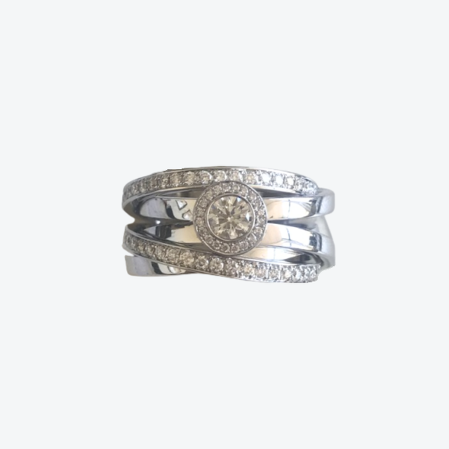 De Krieger ring in 18 karaat witgoud is een verfijnd meesterwerk waarin tijdloze elegantie en schittering centraal staan. De ring is gezet met een centrale briljant geslepen diamant van 0,32 ct in kwaliteit G/Si, omlijst door 106 briljanten van 0,0092 ct in G/VS. Een luxueus en harmonieus ontwerp waarin de kenmerkende Krieger-perfectie tot leven komt.