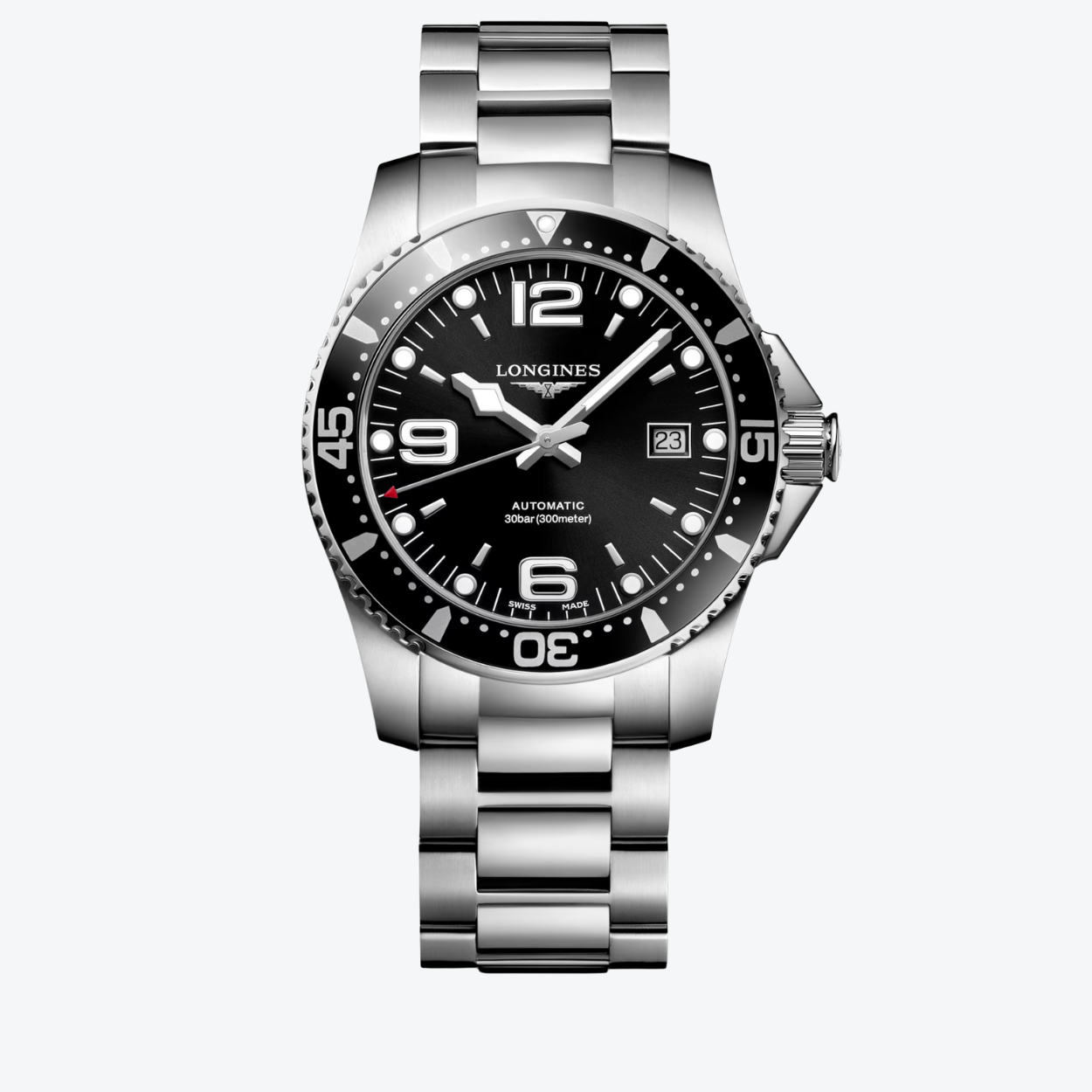 Een elegante ode aan functionele precisie in sportieve vorm: de HydroConquest 41 mm combineert een robuuste ronde kast van roestvrij staal met een unidirectionele duiklunette en een schroefkroon en achterzijde, waardoor hij waterdicht is tot 30 bar (300 m). De sunray‑zwart wijzerplaat met Super‑LumiNova® op indexen en wijzers ademt leesbaarheid, beschermd door saffierglas met AR-coating onderzijde. Binnen huist het automatische L888‑kaliber met uren, minuten, centrale seconden, datum en ca. 72 uur gangreserve. De stalen band met dubbele veiligheid‑vouwsluiting combineert betrouwbaarheid met comfort—een ingetogen statement voor sportieve elegantie, ondersteund door vijfjarige internationale garantie.