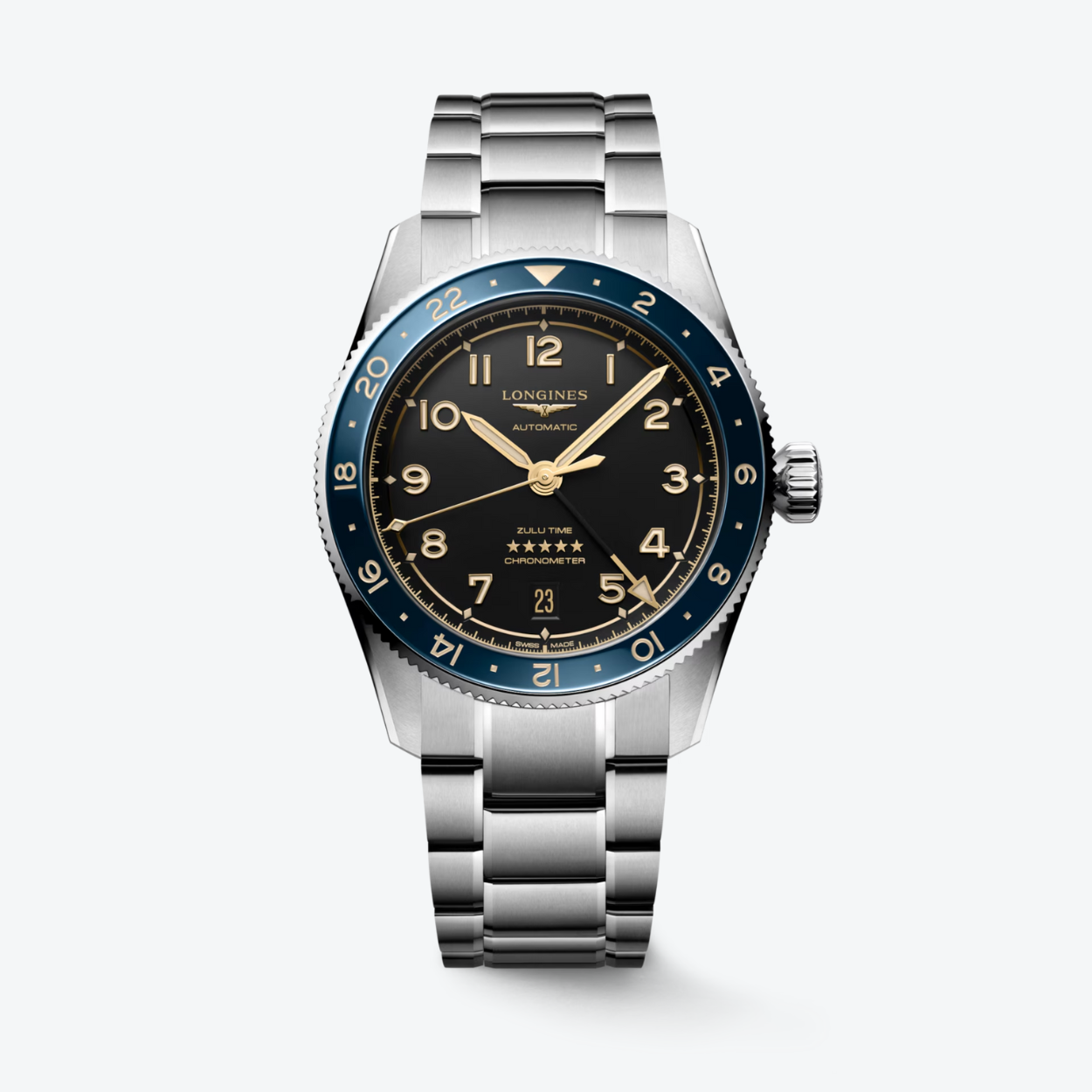 Met dit GMT-horloge breng je wereldreizen subtiel in beeld. De 39 mm roestvrijstalen kast is voorzien van een keramische bidirectionele bezel en saffierglas met AR‑coating, terwijl de antracietkleurige, mat‑finish wijzerplaat rust uitstraalt met goudgepoetste Arabische cijfers en wijzers, verlicht door Super‑LumiNova®. Binnenin slaat het COSC-gecertificeerde automatische kaliber L844.4 met silicium balansveer een krachtige gangreserve van 72 uur. De geschroefde kroon en transparante achterkant tonen de technische verfijning, en de waterdichtheid tot 10 bar (100 m) biedt dagelijkse robuustheid. Afgewerkt met een stalen band met dubbele veiligheid‑vouwsluiting en micro‑adjustment, combineert dit horloge functionaliteit met verfijnde allure — een wereldwijzer in moderne uitvoering.