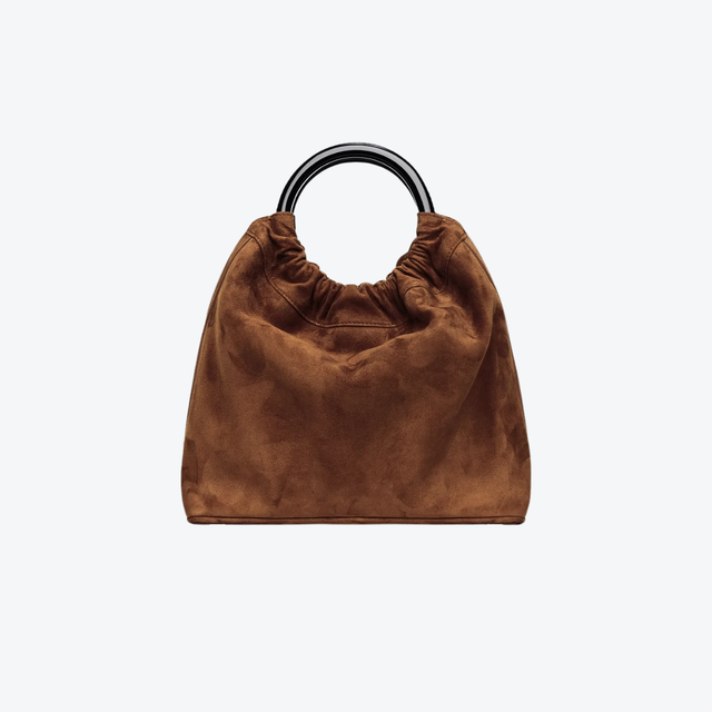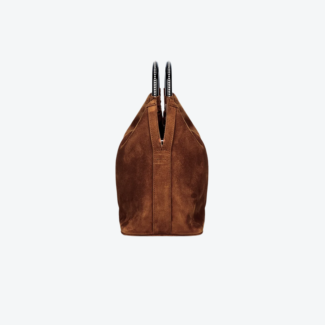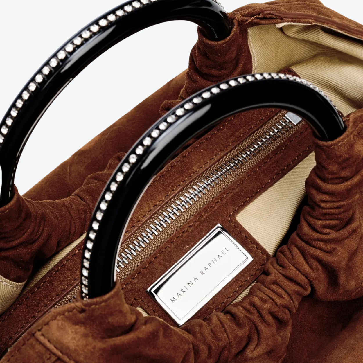 De Marina Raphael Camila Tas F2CASE01221 is een verfijnd top-handle accessoire, vervaardigd uit hazel suède gecombineerd met glanzende zwarte plexiglas handgrepen en fonkelende kristalversieringen. Het interieur is uitgevoerd in beige katoen en de afneembare suède draagband geeft flexibiliteit voor zowel elegante avondmomenten als stijlvolle daglooks. Een elegant en uitgesproken statement voor wie vakmanschap en luxe waardeert.