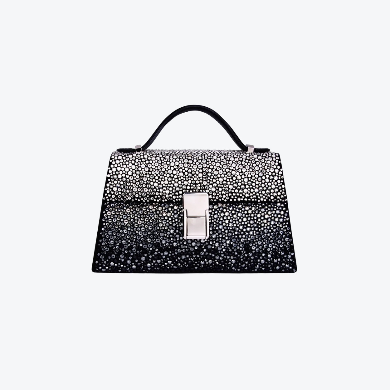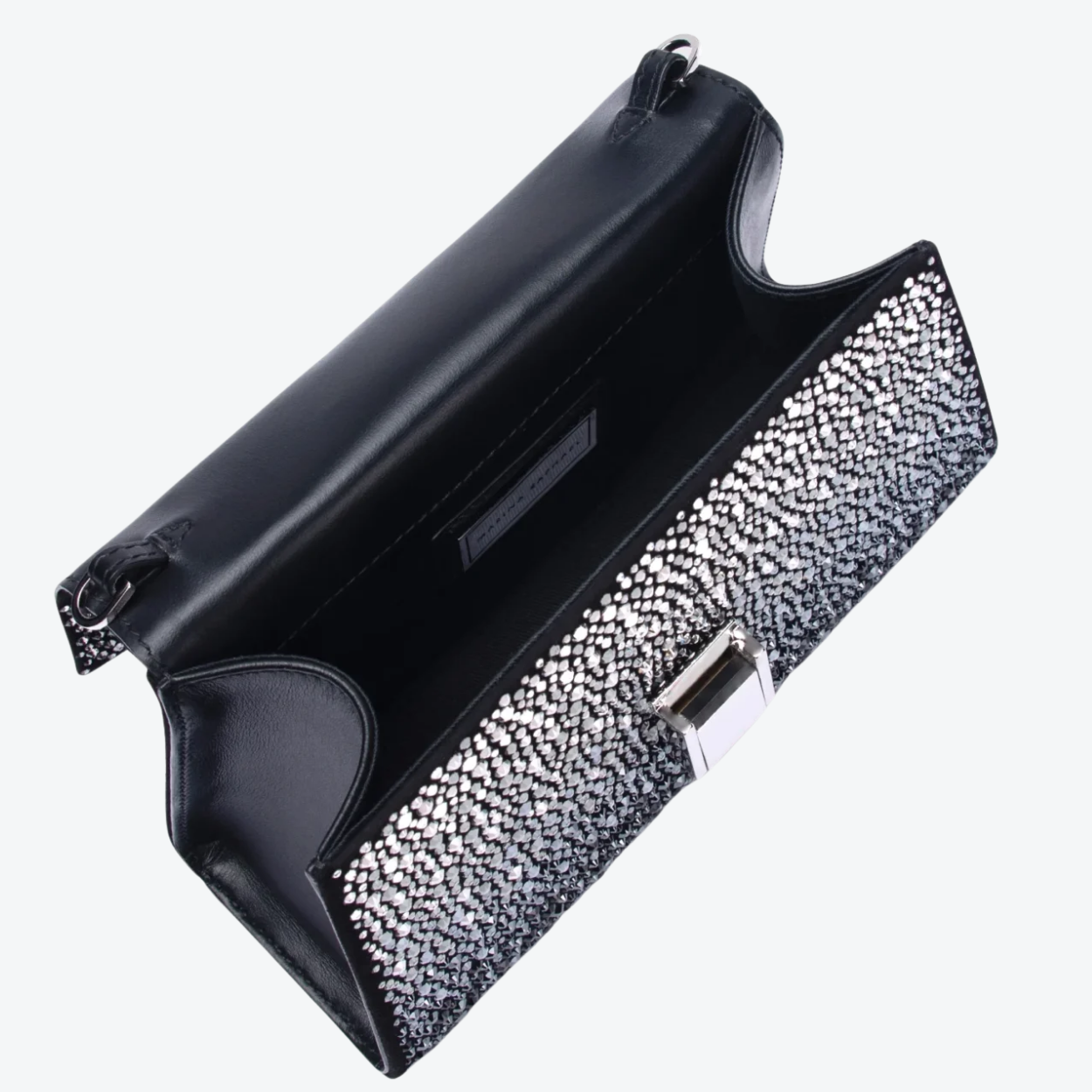De Marina Raphael Micro Stella Tas F7MTSE21001 is een subtiel verfijnd accessoire waarin luxe leer in combinatie met ombré Swarovski-kristallen en zwarte suède tot leven komt. Het compacte model heeft een handgreep en afneembare verstelbare draagband en wordt afgewerkt met zilverkleurige metalen details – een harmonieuze balans van glamour en minimalisme. Ideaal voor stijlvolle momenten waarin elke detail telt en elegantie vanzelfsprekend is.