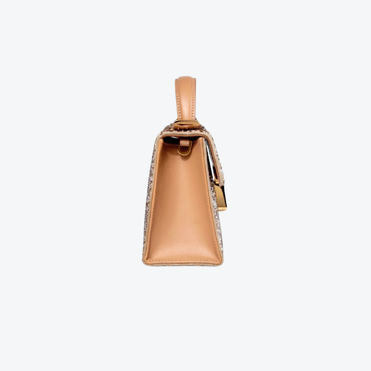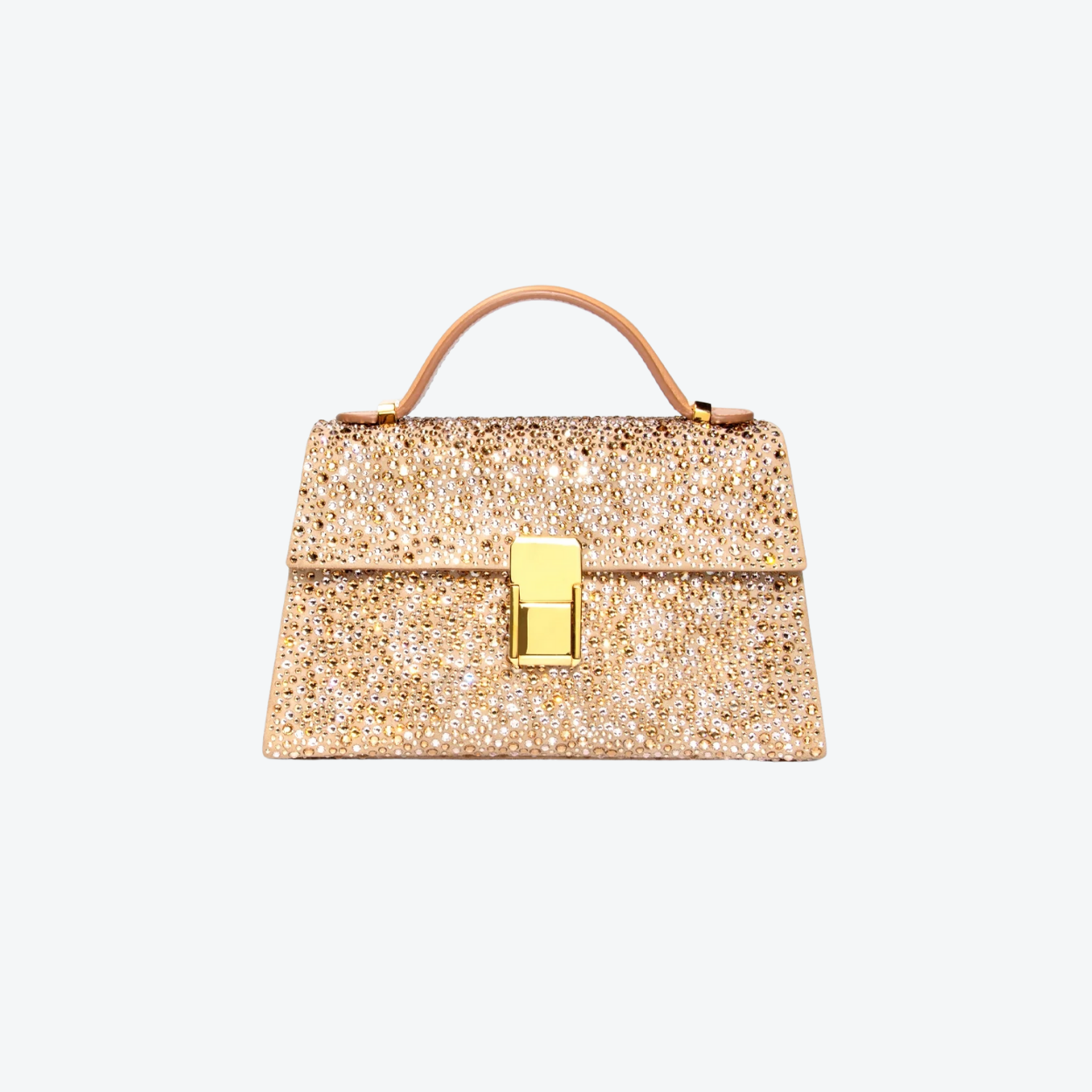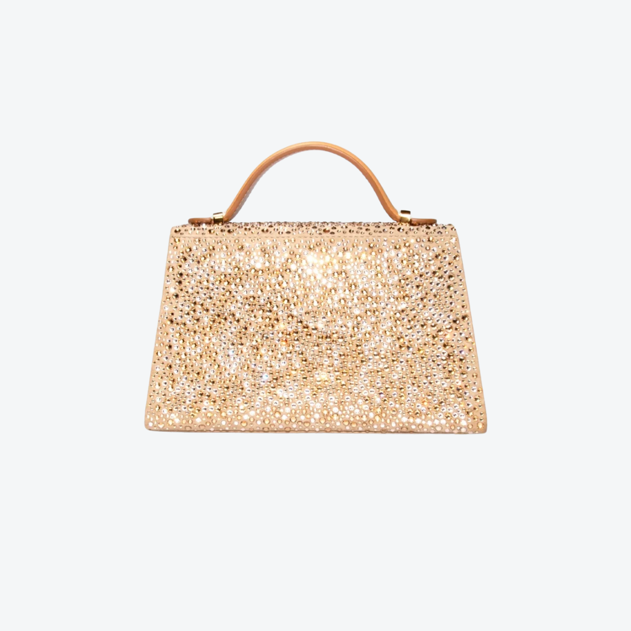De Marina Raphael Micro Stella Tas S6MTSE03280 is een verfijnd accessoire, vervaardigd in zandkleurig suède en napa-leer, verrijkt met fonkelende Swarovski-kristallen en goudkleurige metalen accenten. Het compacte top-handle model beschikt over een verstelbare en afneembare schouderband, waardoor het flexibel inzetbaar is van een stijlvolle daglook tot een elegante avond-setting. Een subtiel luxueus statement voor wie vakmanschap en glamour moeiteloos combineert.