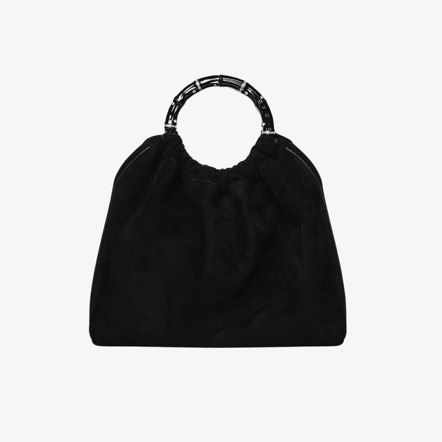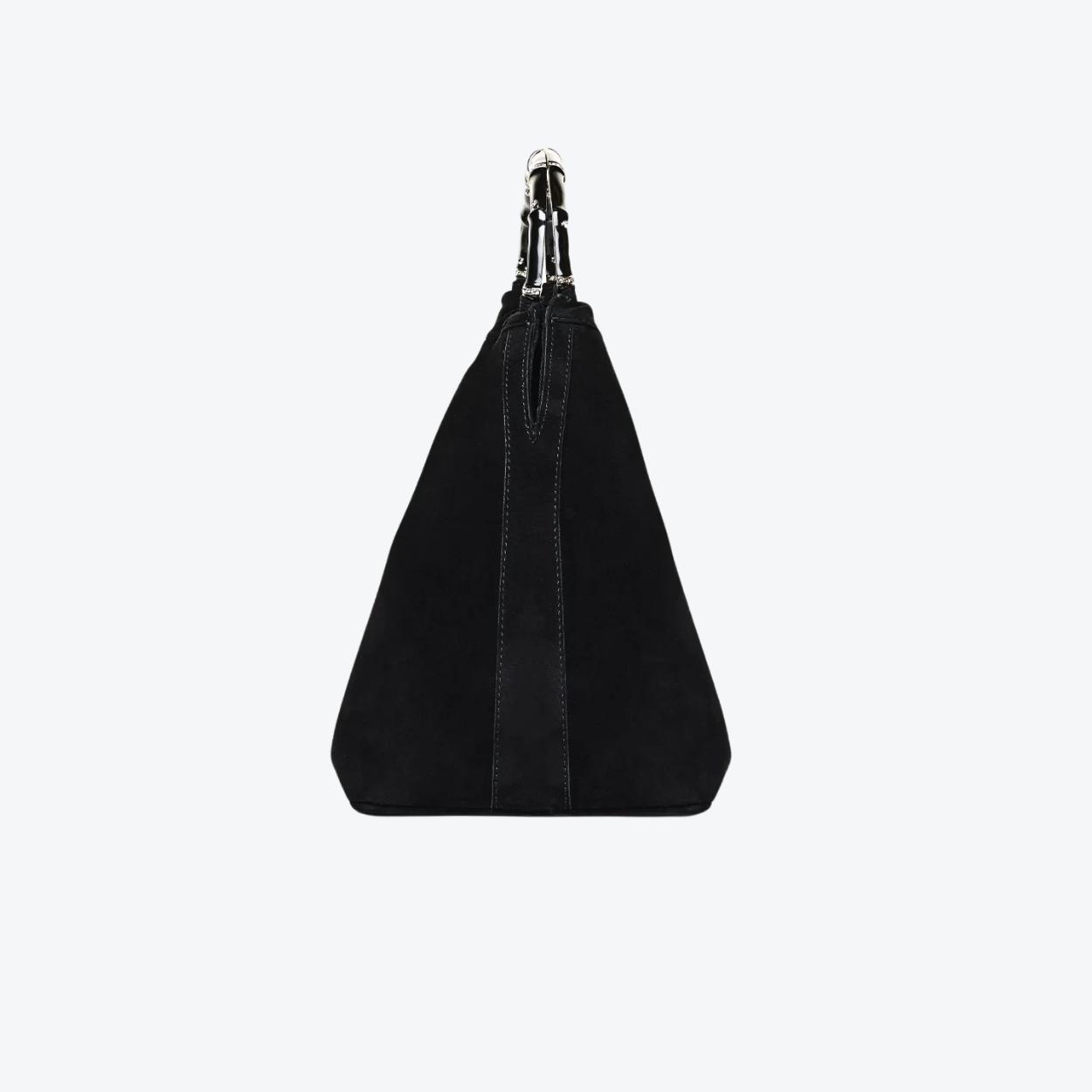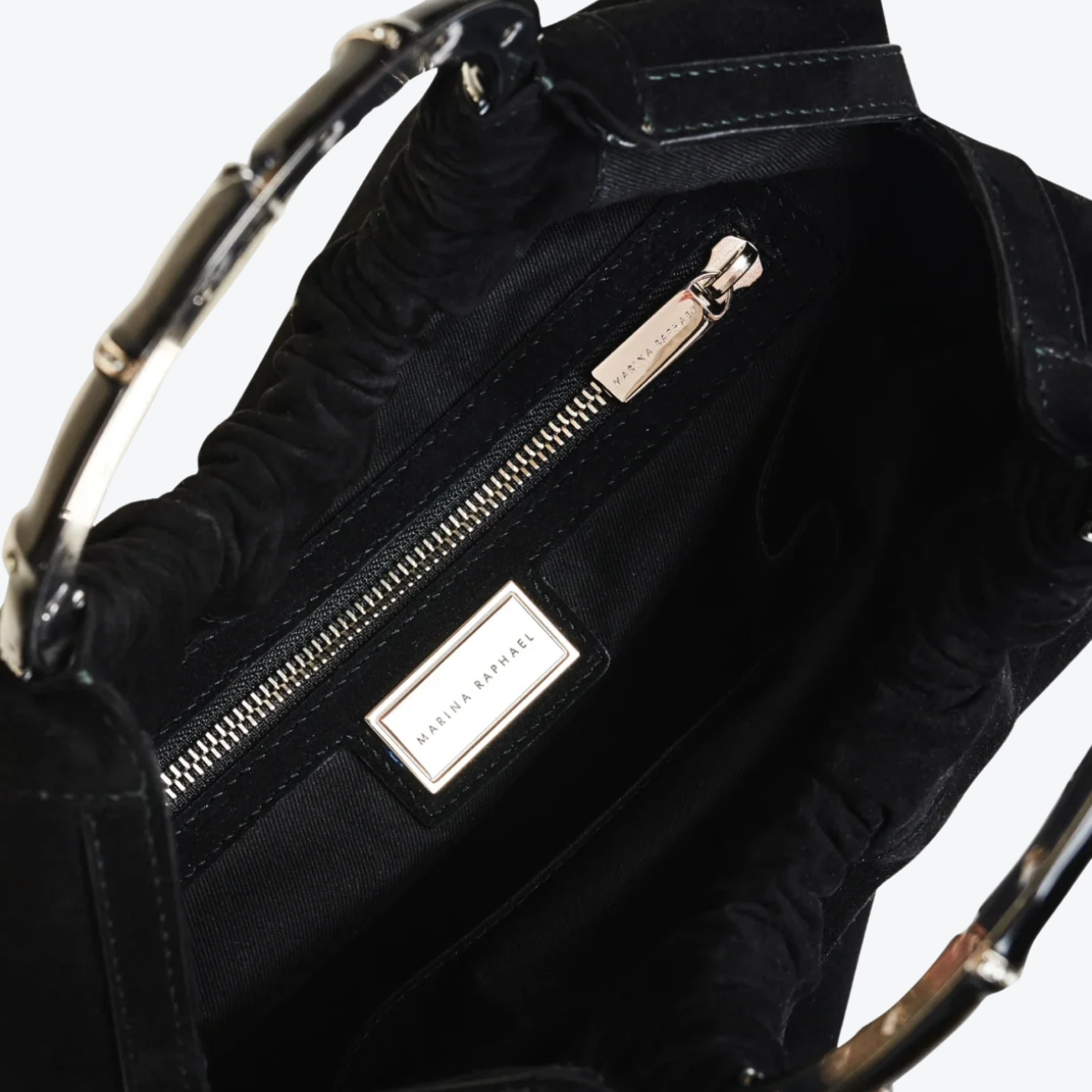 De Marina Raphael Sienna Tas S1SNSE01 is een sculpturaal accessoire, uitgevoerd in zwart suède met rijk versierde bamboe-vormige handgrepen ingelegd met fonkelende kristallen. Het dynamische silhouet combineert luxe vakmanschap met een statement-stijl, terwijl de relatief compacte afmetingen zorgen voor draaggemak zonder in te boeten op elegantie. Een onderscheidend en verfijnd stuk voor wie durft op te vallen met subtiele luxe.