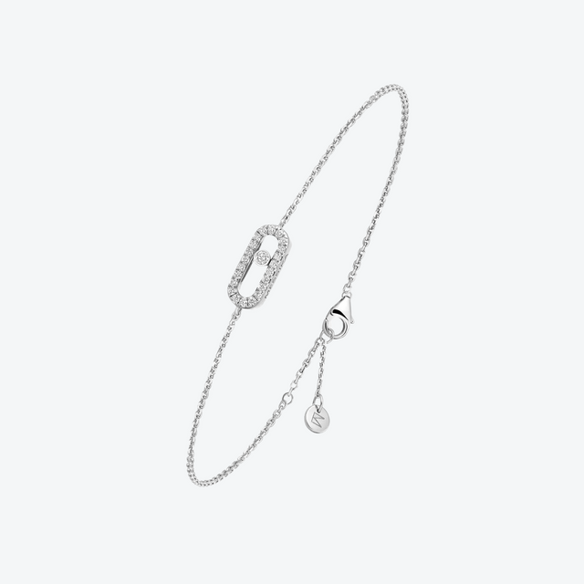 De Messika CARE(s) armband in 18-karaats witgoud combineert ingetogen elegantie met een warme betekenis: het iconische Move Uno motief, subtiel pavé gezet met sprankelende G/VS-diamanten (± 0,07 ct), beweegt lichtjes rond een fijn gedetailleerd kader. De delicate ketting is verstelbaar en omhelst de pols met een fluister van luxe. Elk exemplaar draagt een verhaal — een deel van de opbrengst ondersteunt de Valérie Messika Foundation, waardoor je stijl én compassie uitdraagt.