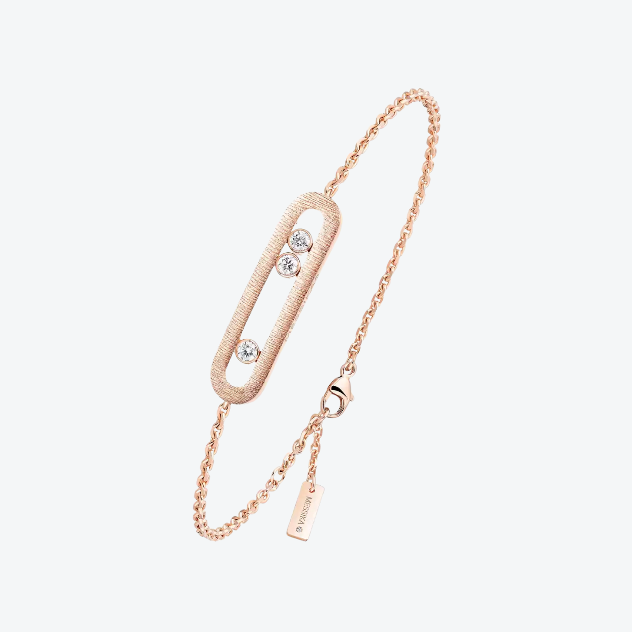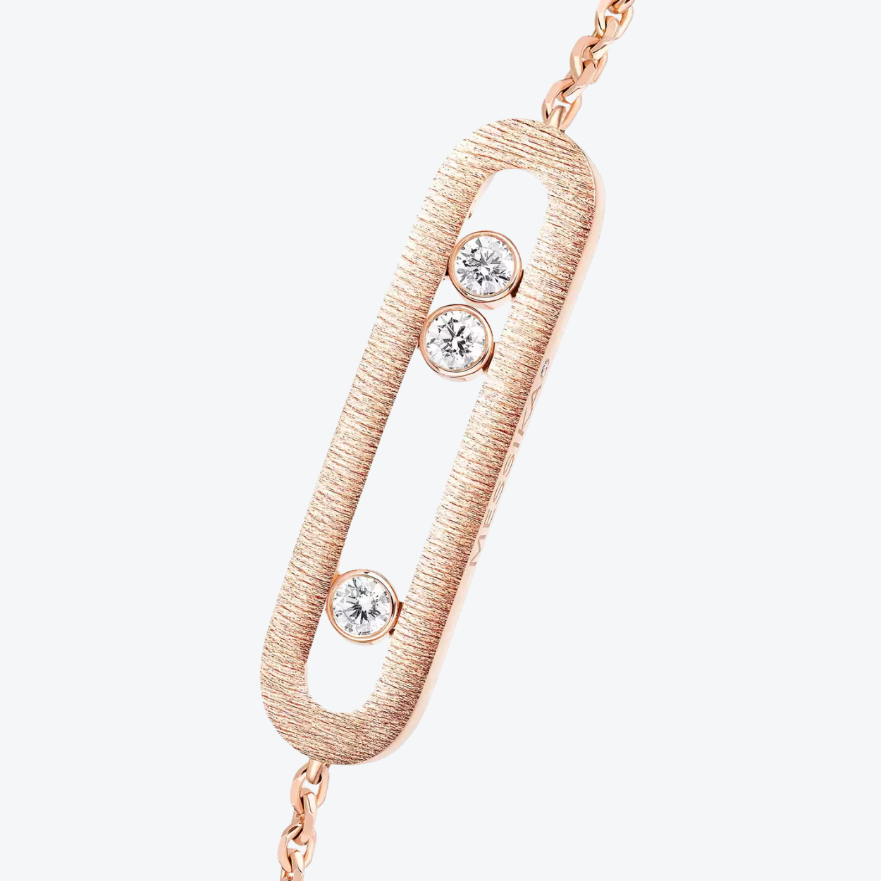 De Messika Move Classique Ciselé armband in 18‑karaats roségoud combineert verfijnde textuur met tijdloze elegantie. In een ovale motif met handgesneden gouden lijnen — als een fluwelen hint van couture — dansen drie briljants (samen 0,20 ct, kwaliteit G/VS) vrij in hun iconische Move‑cage. De grafische eenvoud van het sieraad contrasteert met de tactiele rijkdom van het ontwerp: een subtiel statement dat elke polsbeweging weerspiegelt met een fluister van luxe — ingetogen én expressief tegelijk.