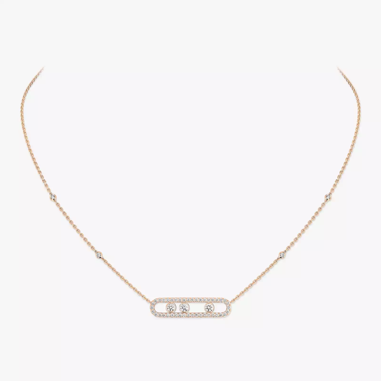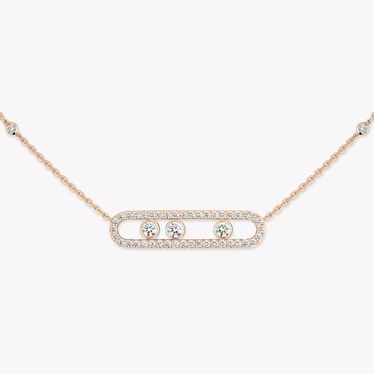 Het Messika Move collier in warm 18‑karaats roségoud is een adembenemende fusie van modernisme en vloeibare elegantie. Drie briljanten (elk 0,08 ct, G/VS-kwaliteit) dansen vrij in een fijn pavé‑gevat motief terwijl de dubbele ketting licht om de hals valt. Het roségoud versterkt hun glans; elke beweging vangt licht op een subtiele, ritmische manier — tijdloos, vrouwelijk en exact dat statement dat fluistert zonder te schreeuwen.