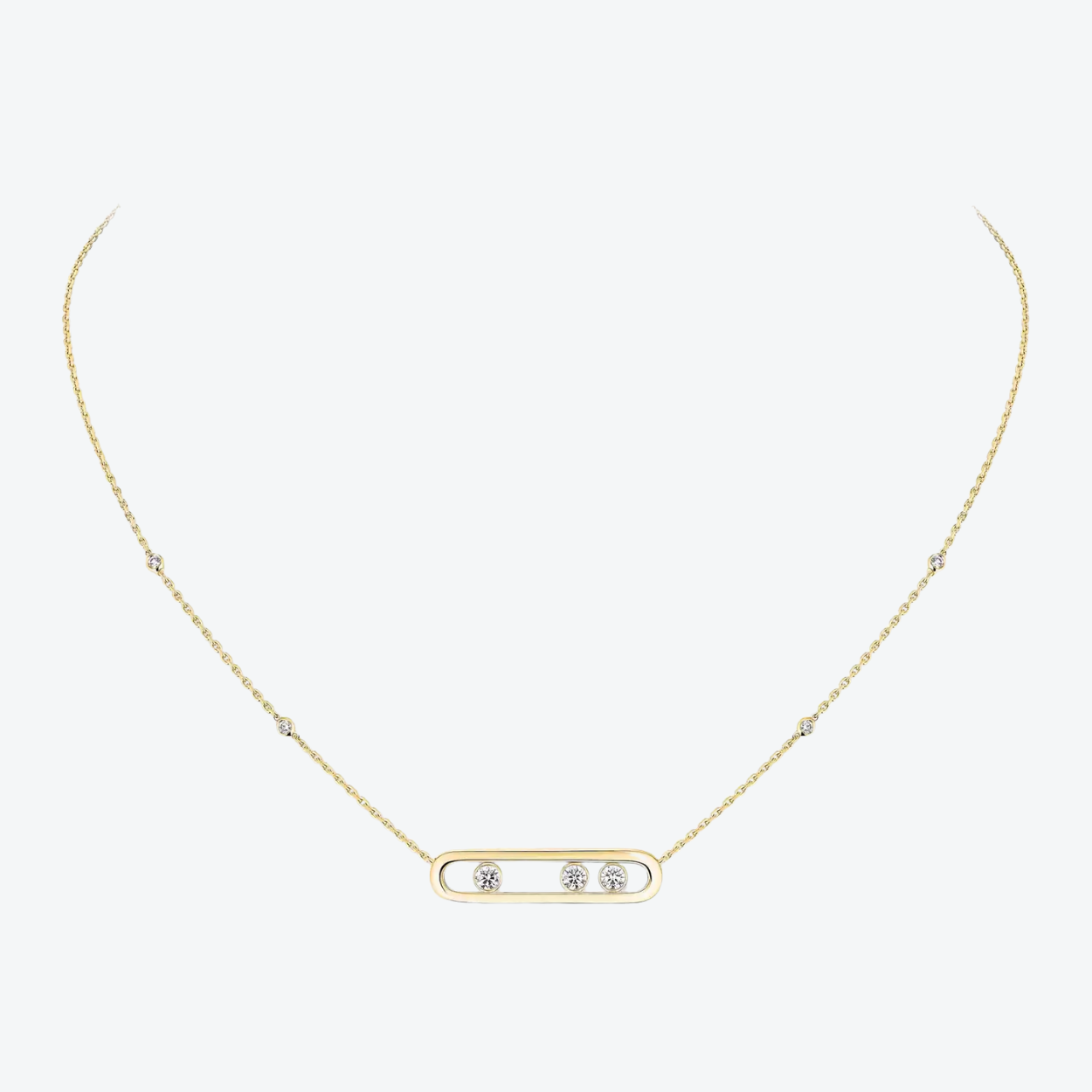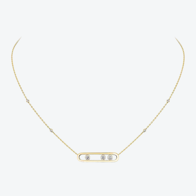 Het Messika Move collier in 18-karaats geelgoud legt een subtiel accent van beweging en luxe vast: drie briljanten (in totaal 0,25 ct, kwaliteit G/VS) bewegen speels binnen een verfijnde cage aan een dubbele, fijne ketting. De warme gloed van het goud omlijst de dansende diamanten en vangt licht met elke beweging, waardoor dit sieraad tijdloos elegant is, fluisterend chic zonder te schreeuwen.