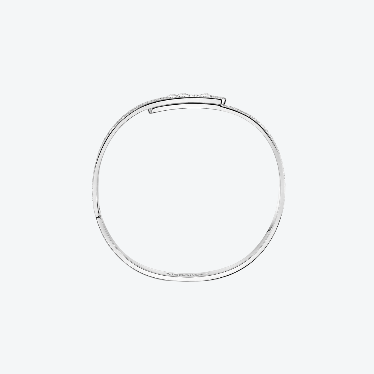 De Messika Move Noa Pavé bangle in 18‑karaats witgoud is een harmonische ode aan tijdloze elegantie: drie vrij bewegende briljanten — symbool van verleden, heden en toekomst — glanzen speels tussen een rijk bedekte diamantpavé. De glanzende omhulling van diamanten accentueert de fluweelzachte witgloed van het goud, terwijl het subtiele maar krachtige ontwerp een verfijnd statement maakt. Perfect om solo te dragen of te combineren met andere sieraden, deze armband ademt luxe met ingetogen allure.