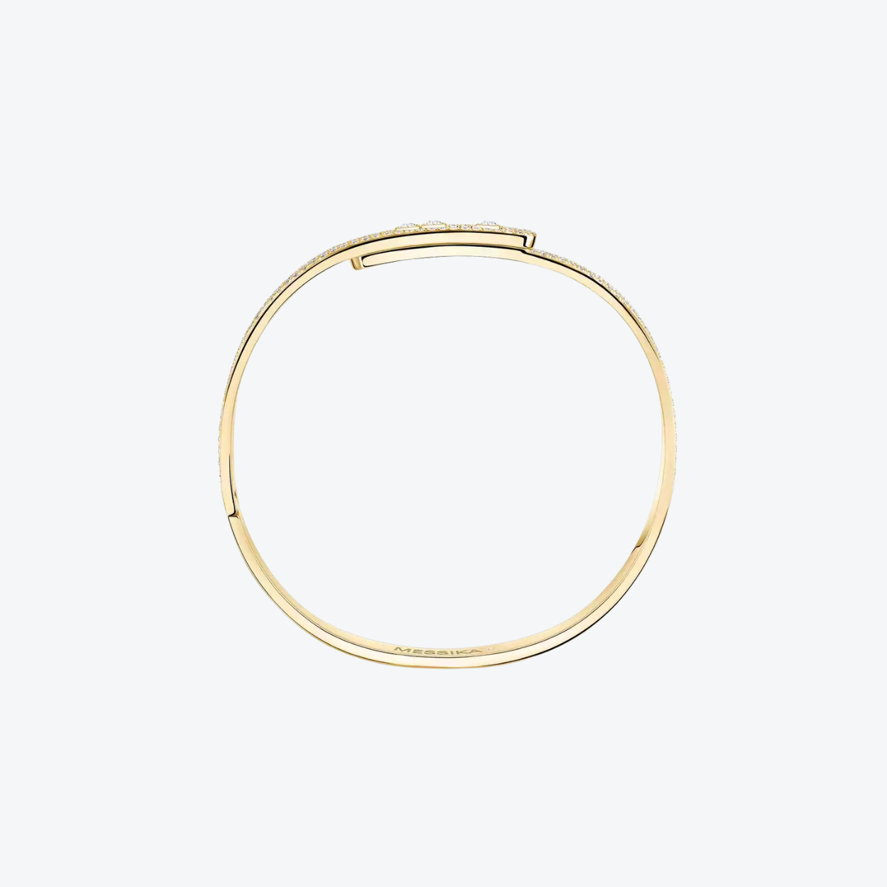De Messika Move Noa full pavé armband in 18-karaats geelgoud is een verleidelijk grafisch symbool van luxe: drie los bewegende briljanten glanzen als tijdloze herinneringen tussen een volledig bedekte pavéband. De warme gloed van het geelgoud versterkt hun schittering en brengt een verblindende elegantie. Dankzij het subtiele, geïntegreerde sluitmechanisme leg je deze bangle eenvoudig om — een dagelijkse luxe die stiekem fluistert en groots uitstraalt.