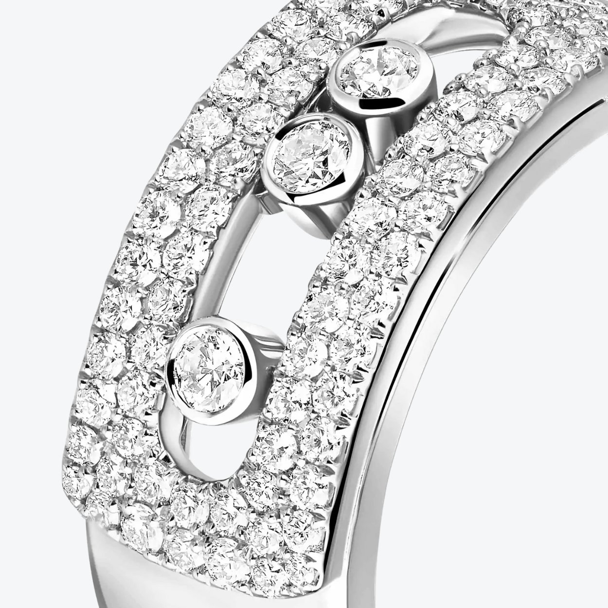 De Messika Move Noa ring in 18‑karaats witgoud is een ingetogen symfonie van elegantie en speelsheid. Een fijn pavé‑bandje omlijst een grafisch gearticuleerde cage waarin drie briljantgeslepen diamanten vrij bewegen — elk een fluistering van licht en luxe. Met een totaal gewicht van 0.73 ct in G/VS‑kwaliteit straalt deze ring een sierlijke balans uit tussen modern design en tijdloze allure. Chic, zachtaardig en subtiel opvallend — een sieraad dat zowel spreekt als stil blijft.