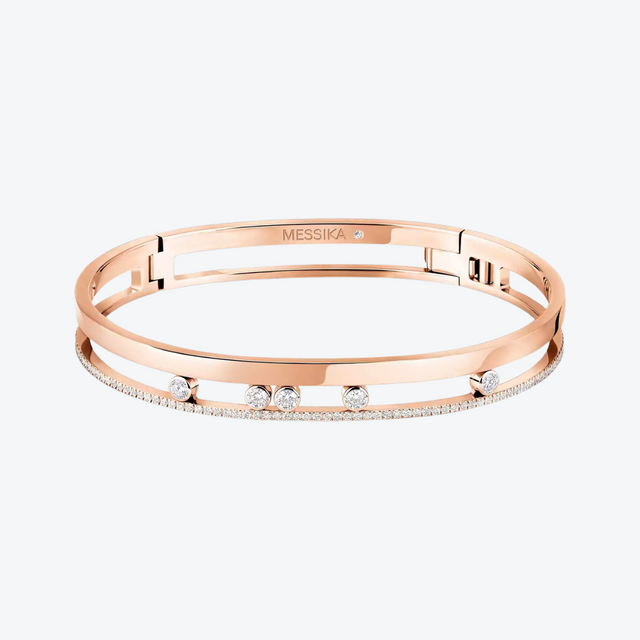 De Messika Move Romane bangle in 18-karaats roségoud is een verfijnd statement van asymmetrische elegantie: vijf vrij bewegende briljant geslepen diamanten zweven tussen een fijn diamantlint en warme gouden banden, gevangen in een open en slank silhouet. De grafische zuiverheid van het ontwerp contrasteert met de zachte roségloed, waardoor het sieraad een tijdloze en moderne allure krijgt—perfect voor verfijnde momenten, of een subtiele focus op luxe.