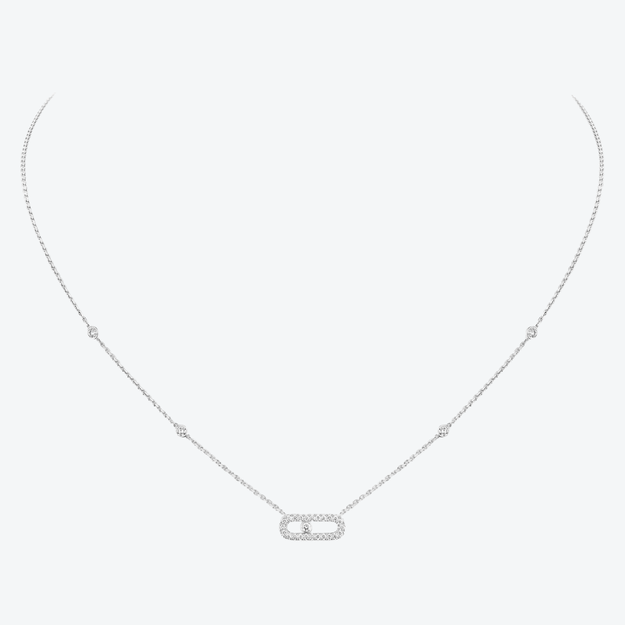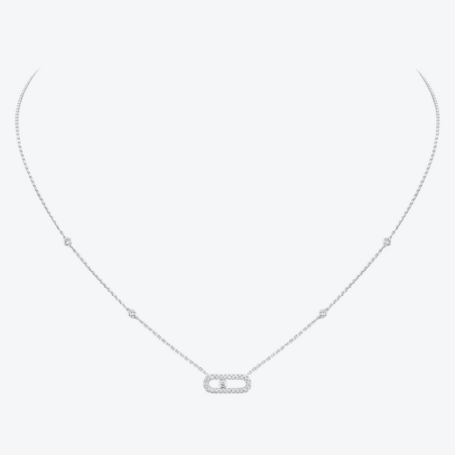 Het Messika Move Uno collier in 18‑karaats witgoud is een subtiele viering van diamantbeweging en sierlijke eenvoud. Een briljant van 0,22 ct (G/VS) danst vrij in een pavé‑gezet ‘Move‑cage’, zwevend aan een verfijnde ketting. Elke beweging vangt licht; elke glans fluistert elegantie. Perfect voor elke dag, moeiteloos chic en tijdloos modern.