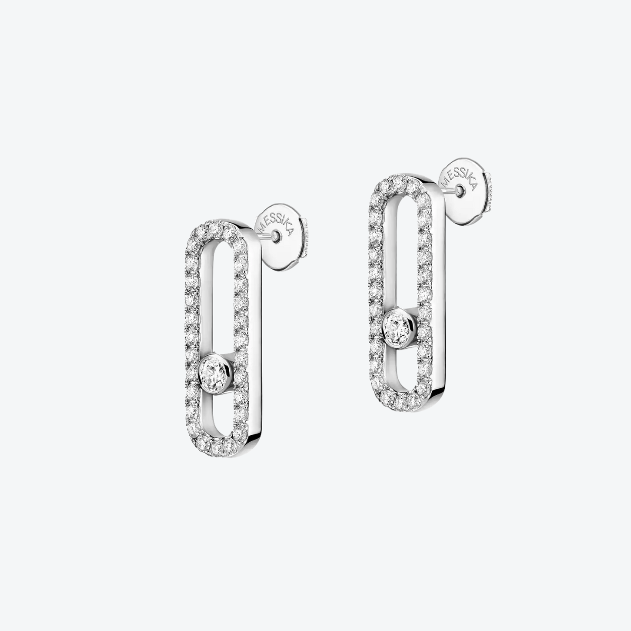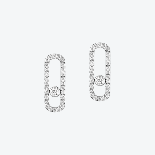 De Messika Move Uno oorbellen in 18‑karaats witgoud balanceren minimalistische elegantie met sprankelende expressie. Elke oorbel bevat bewegende briljanten (totaal 0,66 ct G/VS) die delicate dynamiek en lichtvangende pracht brengen binnen een verfijnde pavé‑omlijsting. Het strakke grafische silhouet wordt elegant afgerond met een Alpa‑clip sluiting, waardoor stijl en comfort hand in hand gaan. Een alledaagse luxe die fluistert, zonder te schreeuwen.