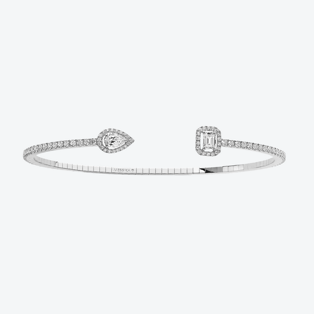De Messika My Twin Skinny armband in 18‑karaats witgoud omhelst de pols met verfijnde elegantie: twee centrale diamanten – één peer‑geslepen en één emerald‑geslepen van elk 0.15 ct (F/VS) – zweven aan weerszijden van de pols, omringd door een subtiel pavéband die fonkelt bij elke beweging. Dankzij het skinny-systeem met gouden microveren sluit het sieraad comfortabel aan en blijft het speels in beweging. Een tedere balans tussen grafische puurheid en vrouwelijke finesse voor dagelijks draagplezier.