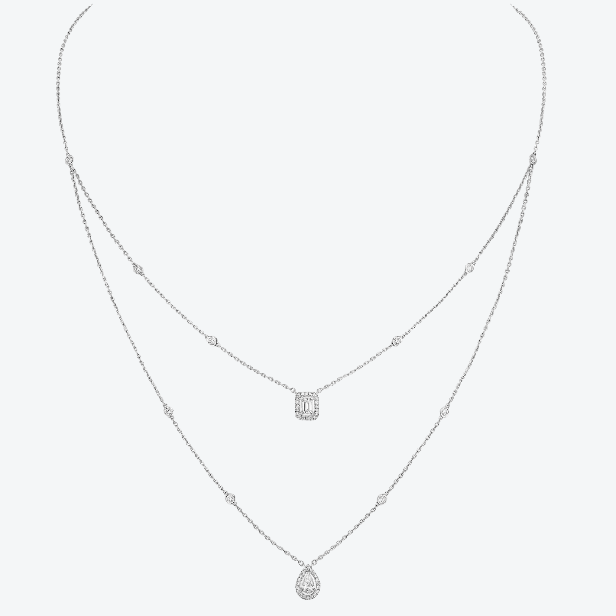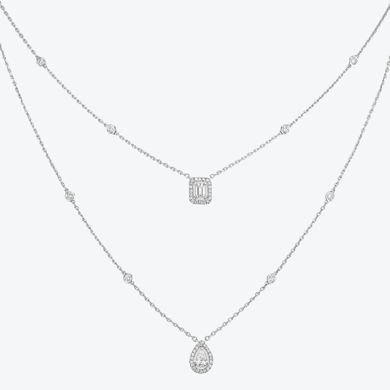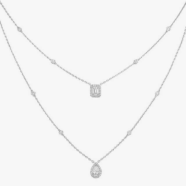 Het My Twin 2-Rows collier in 18-karaats witgoud omhelst delicate gelaagdheid met grafische precisie: twee kettingen met verschillende lengtes, dragen elk een solitaire diamant—een elegant peer geslepen diamant met een gewicht van 0,20ct en een scherp emerald geslepen tegenhanger van eveneens 0,20ct—die samen het licht vangen in een ingetogen dans rond de hals. De glans van zuiver witgoud versterkt hun schittering, terwijl de verstelbare lengte subtiele veelzijdigheid belooft, ideaal voor zowel een verfijnde blouse als een ingetogen avondlook. Een moderne ode aan evenwicht, elegantie en ingetogen luxe.