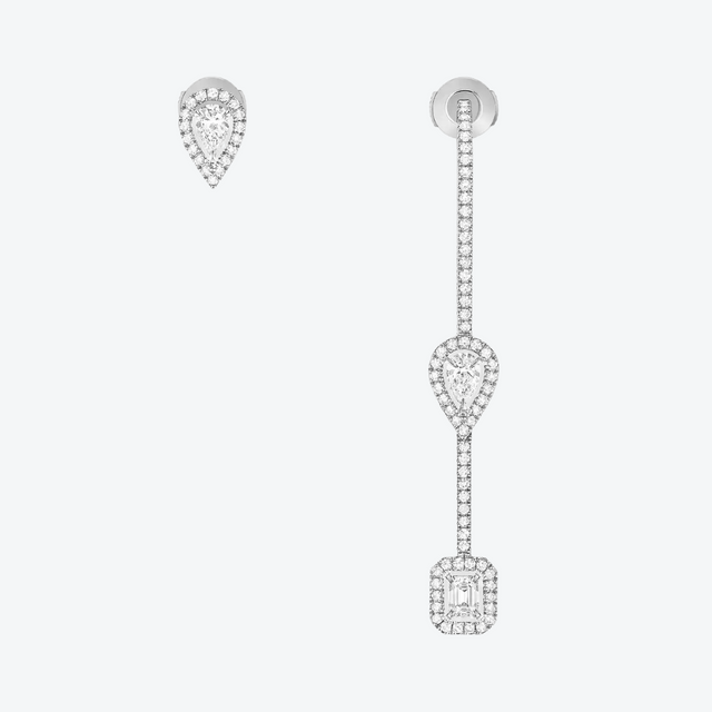 Deze Messika My Twin oorbellen in 18-karaats witgoud spelen subtiel met asymmetrie en grafische finesse: ene zijde onthult een parelgeslepen diamant in een halo-omlijsting, terwijl de andere zijde een fijne, diamant-belegde staaf met verdiepte vorm achter en voor het oor laat zweven. De combinatie van witgoud en sprankelende diamanten creëert een edgy elegantie, die moeiteloos van gesofisticeerde kantoorlooks naar verfijnde avondmomenten verschuift. Een moderne statement piece met karakter en verfijnde allure.