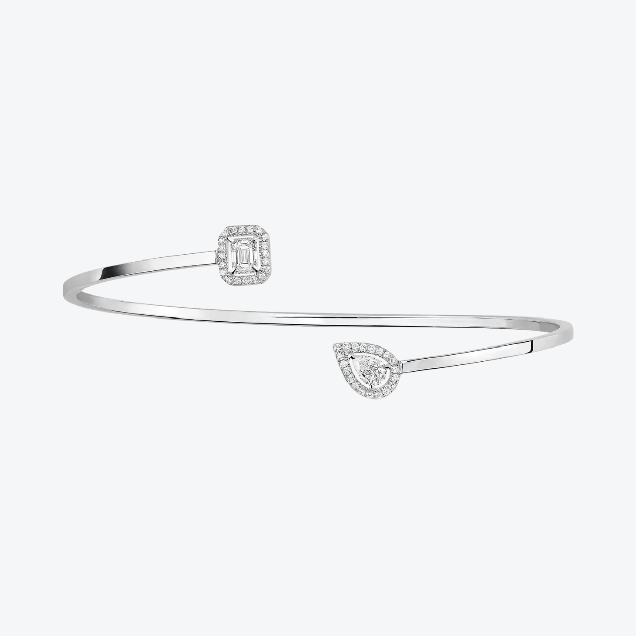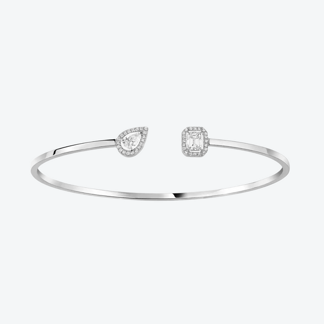 Deze Messika My Twin Toi & Moi armband in 18-karaats witgoud combineert minimalistische finesse met een speelse poëtiek: aan de ene zijde fonkelt een peer geslepen diamant, aan de andere een geometrisch smaragdslijpsel — beide omlijst met een halo van briljant geslepen diamanten, alsof ze elkaar bijna raken. Het flexibele, subtiel open ontwerp fluistert elegantie en verfijning rond de pols, terwijl de glanzende witgloed de lichtheid van de diamanten accentueert. Een sierlijke balans tussen moderniteit en intimiteit, perfect voor zowel ingetogen dagelijkse luxe als sprankelende avond momenten.
