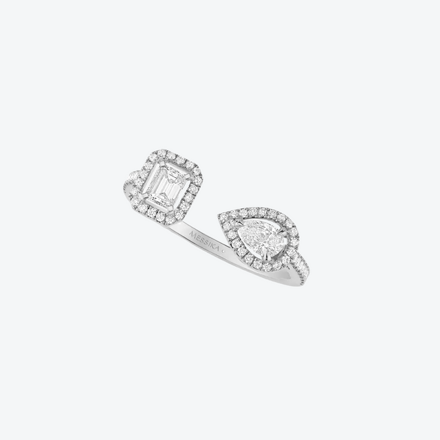 De Messika My Twin Toi & Moi ring in 18-karaats witgoud is een elegant duet van vormen: een vloeiende peer-geslepen diamant ontmoet een strakke emerald-geslepen diamant in een open band, omlijst door sprankelende briljantpavé. De open, grafische structuur contrasteert met de warme witgloed van het goud, waardoor een tijdloos én modern statement ontstaat – perfect voor momenten van liefde en stijl. Sober, geraffineerd, bijzonder.
