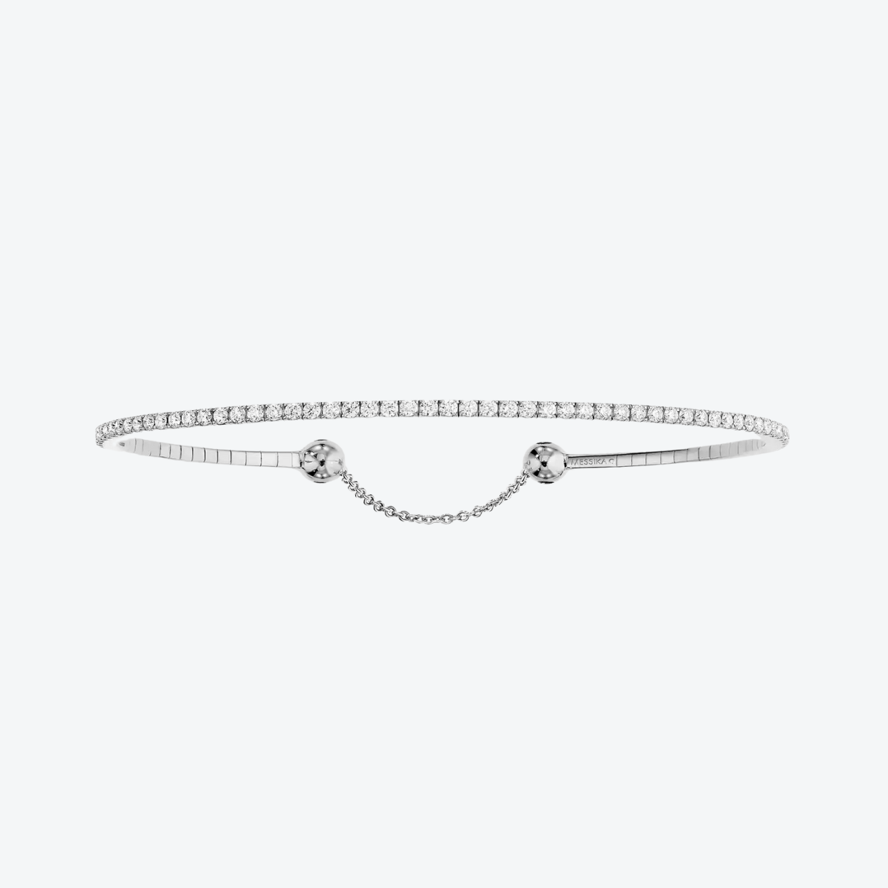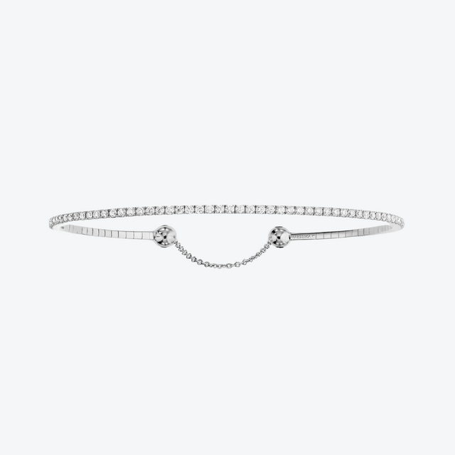 De Messika Skinny armband in 18-karaats witgoud voelt aan als een tweede huid: het ultradunne design is bezaaid met fonkelende diamanten (0.80ct G/VS), vastgehouden door ingenieuze microveren die zacht en elegant rond de pols vallen. De diamantglans fluistert verfijning terwijl de subtiele structuur een gevoel van gewichtloze luxe wil overbrengen. Draag hem solitair of als onderdeel van een stijlvolle stack—een tijdloos én modern statement.