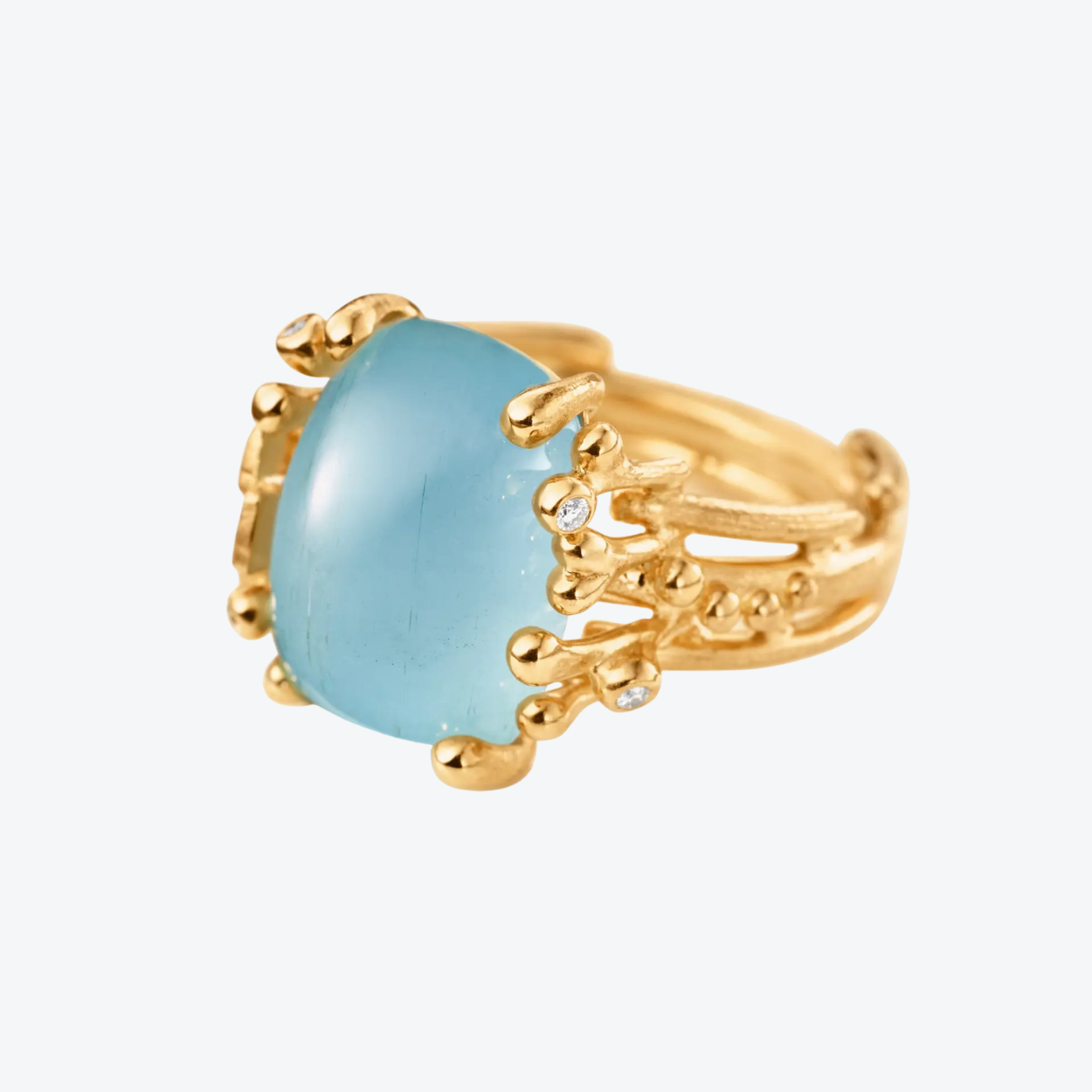 De Ole Lynggaard BoHo ring medium A2933-402 ademt karakter en verfijning, in een ontwerp dat elegantie en ambachtelijkheid combineert. Deze ring is vervaardigd uit 18 karaat geelgoud en is gezet met een cabochon geslepen aquamarijn van 8,3 karaat (15×11 mm), vergezeld van vijf briljant geslepen diamanten met een totaalgewicht van 0,04 ct (TW/VS). De goudsmeden hebben met de hand hamerslag- en gepolijste oppervlakken gecreëerd om een subtiel spel van licht en textuur mogelijk te maken. Dit juweel staat voor luxe, stijl en een verfijnde blik op natuurlijke vormen.
